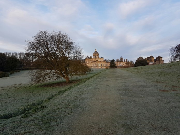 I was told that my bath would have one of the great views of England and indeed it did: out across the lawns to the north of the house towards the Great Lake, which was dug out by the fifth Earl when he had recovered his finances some time in the 1790s and, beyond that, to the estate village of Coneysthorpe and, in the distance, the Howardian Hills:-