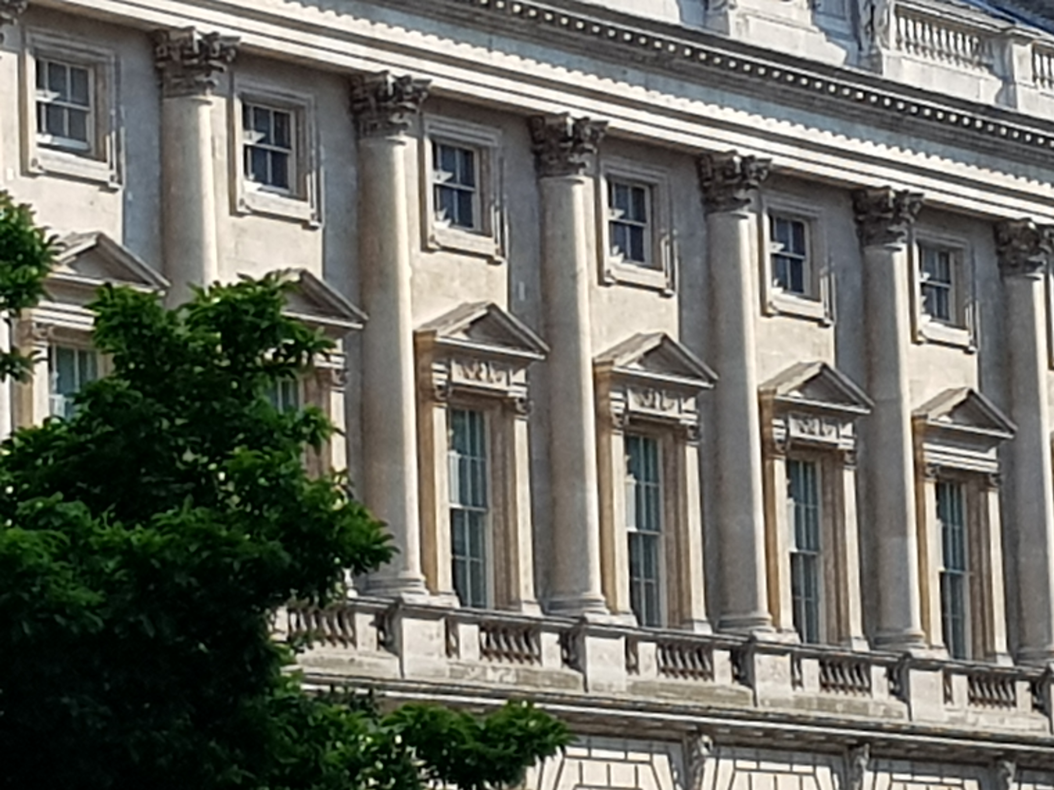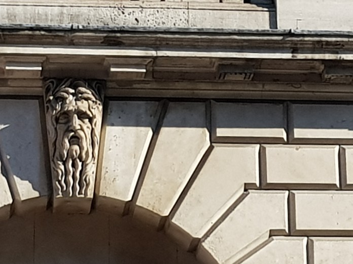 I have often posted photographs of the courtyard of Somerset House, where the Royal Academy used to be, occupying the rooms which are now the Courtauld Institute gallery; but I don’t think that I have ever previously photographed William Chambers’s grand, monumental, neoclassical entrance façade, announcing his project built for the government off the busy highway of the Strand and with keystones representing the rivers of England:-