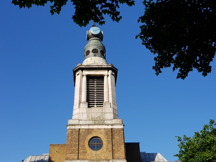 This is one of the more esoteric views of London because it is nearly impossible to appreciate the façade, let alone, the interior of St. Anne, Soho, because it is protected from the street by very high curved fencing. But passing it this evening, I noticed that someone was cleaning the churchyard of rubbish and guessed – correctly – that the door from the street might be unlocked. So, this is a view of the church tower, added in 1800 by Samuel Pepys Cockerell, the surveyor to the Bishop of London, to the body of a church said to have been designed in 1677 by either Talman or Wren:-