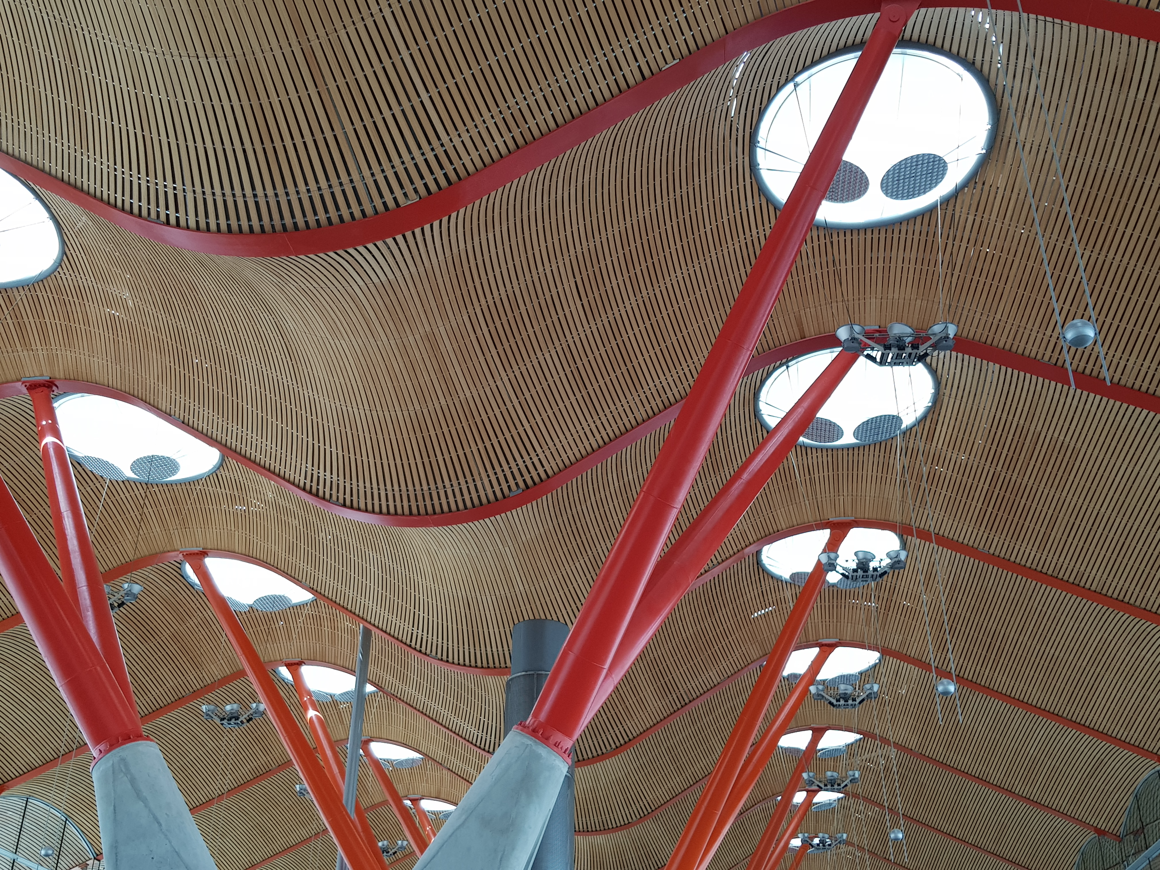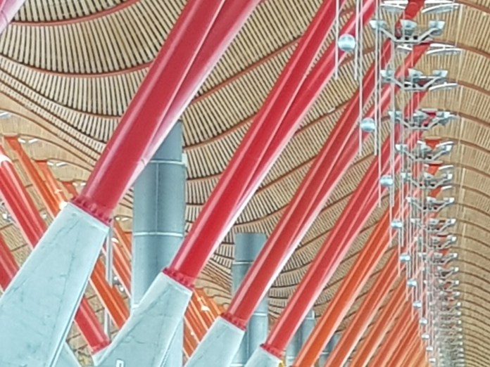I suppose we didn’t need the crashing of the British Airways IT system to demonstrate our total dependency on computerisation. We arrived at Heathrow for a flight to Madrid. Long queues. No indication as to what had happened. Eventually we were checked in. We were told that our flight hadn’t yet left Madrid, so we had breakfast and went shopping. Then, Romilly luckily spotted the last call for our flight. We rushed to the Gate. We’ve made it to Madrid, but our luggage hasn’t. The only compensation was the sight of Richard Rogers’s beautifully elegant, curved and coloured roof to Madrid Airport, part of the great programme of public works by the Spanish government in the 1990s (opened in 2006):-