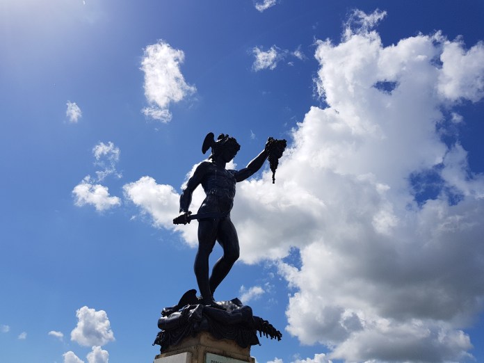 The gardens were maintained for public benefit, with a dance hall, until the proximity of a local colliery led the Sutherlands to transfer its ownership first to the property developer John Broome, when much of the statuary is said to have been removed, and subsequently to the National Coal Board, when it was vandalised. In 1996, the estate was acquired by St. Modwen’s Properties who have done a great deal to revive it without public funding, following plans drawn up by Todd Longstaffe-Gowan and Tom Stuart-Smith and with planting by Piet Oudolf. At the far end of the parterre is the copy of Cellini’s Perseus which we borrowed for the Bronze exhibition:-