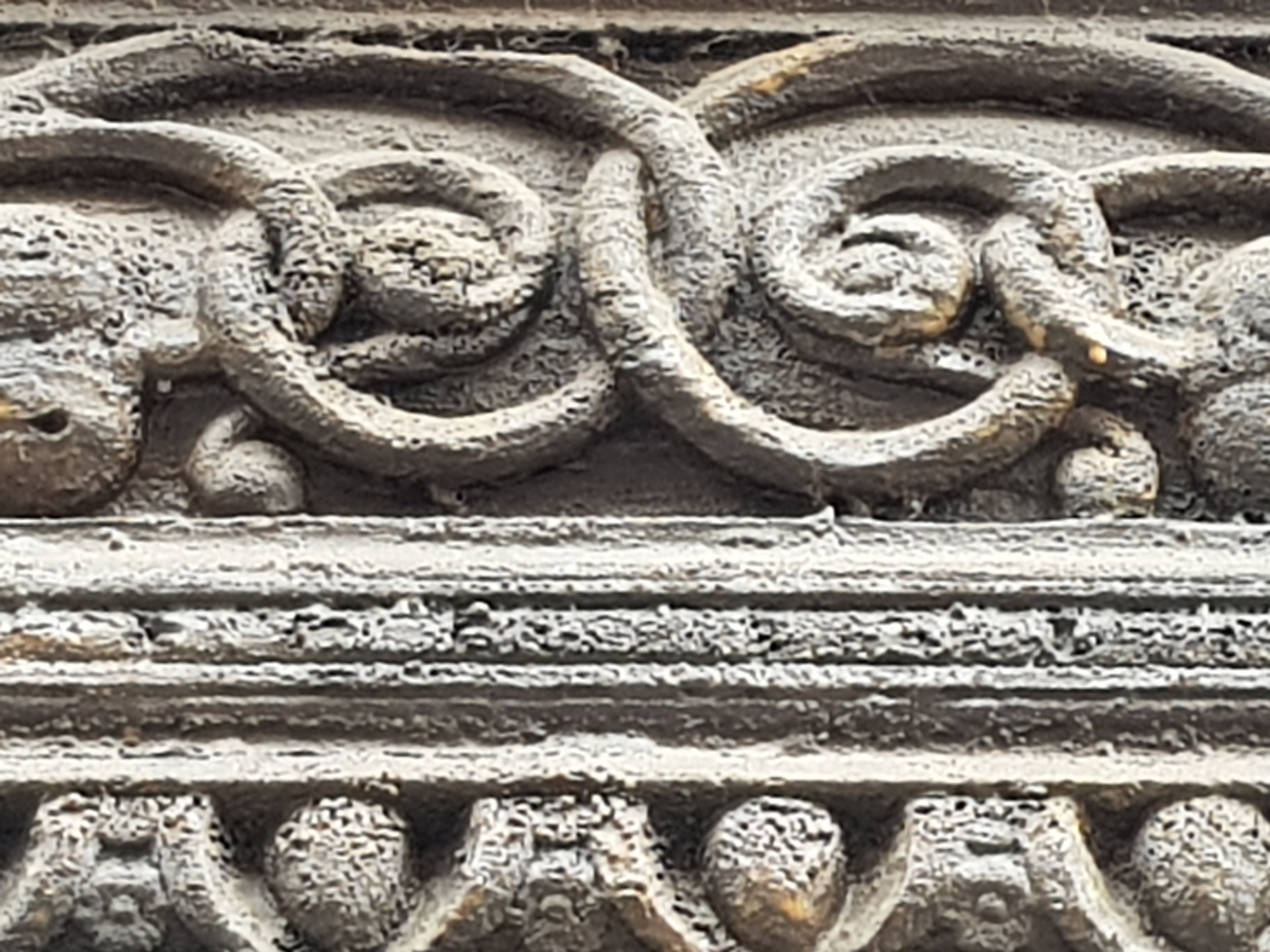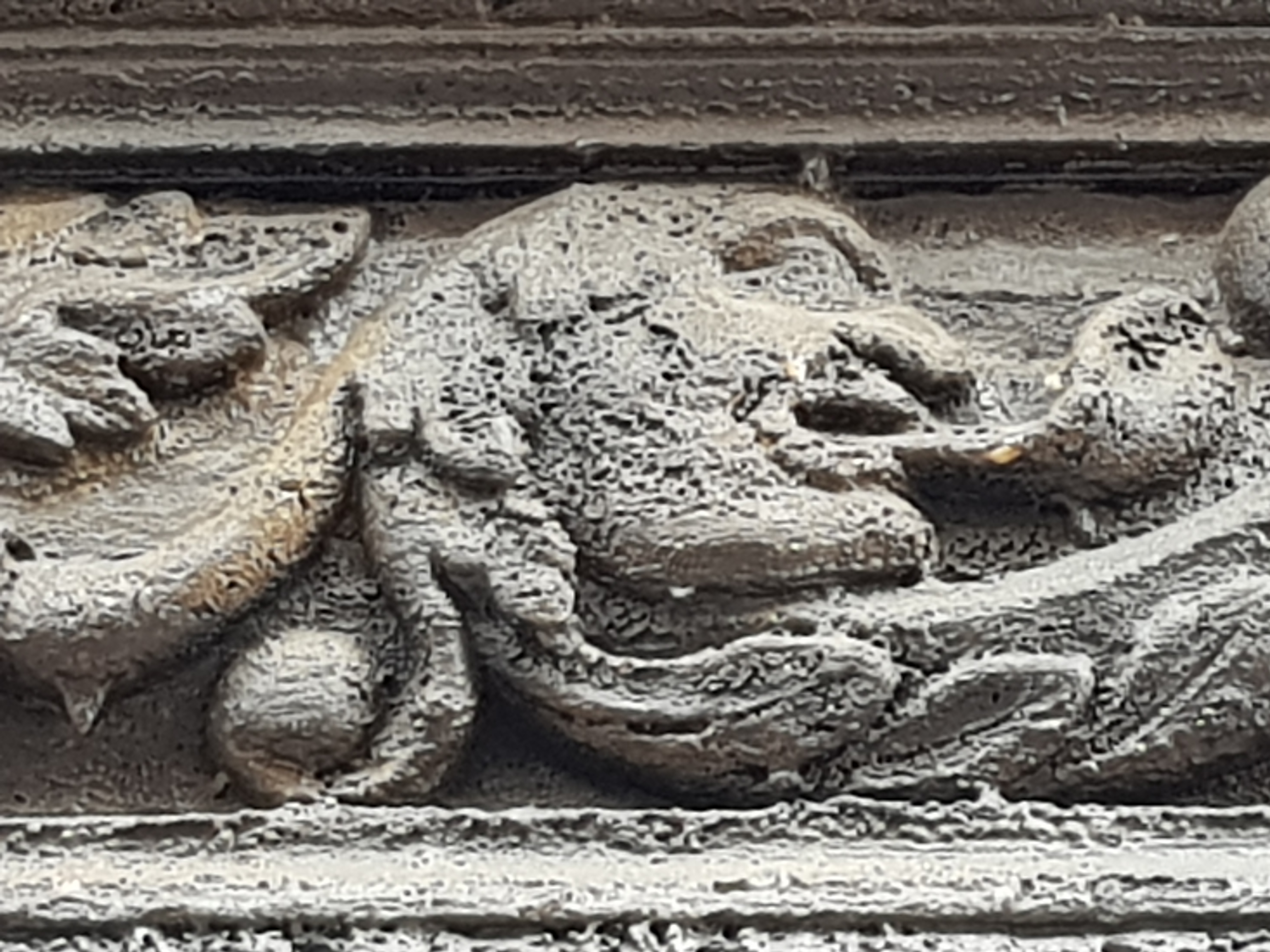 We walked down the so-called Thoroughfare, past a coffee shop with mid-seventeenth-century wood carving:-