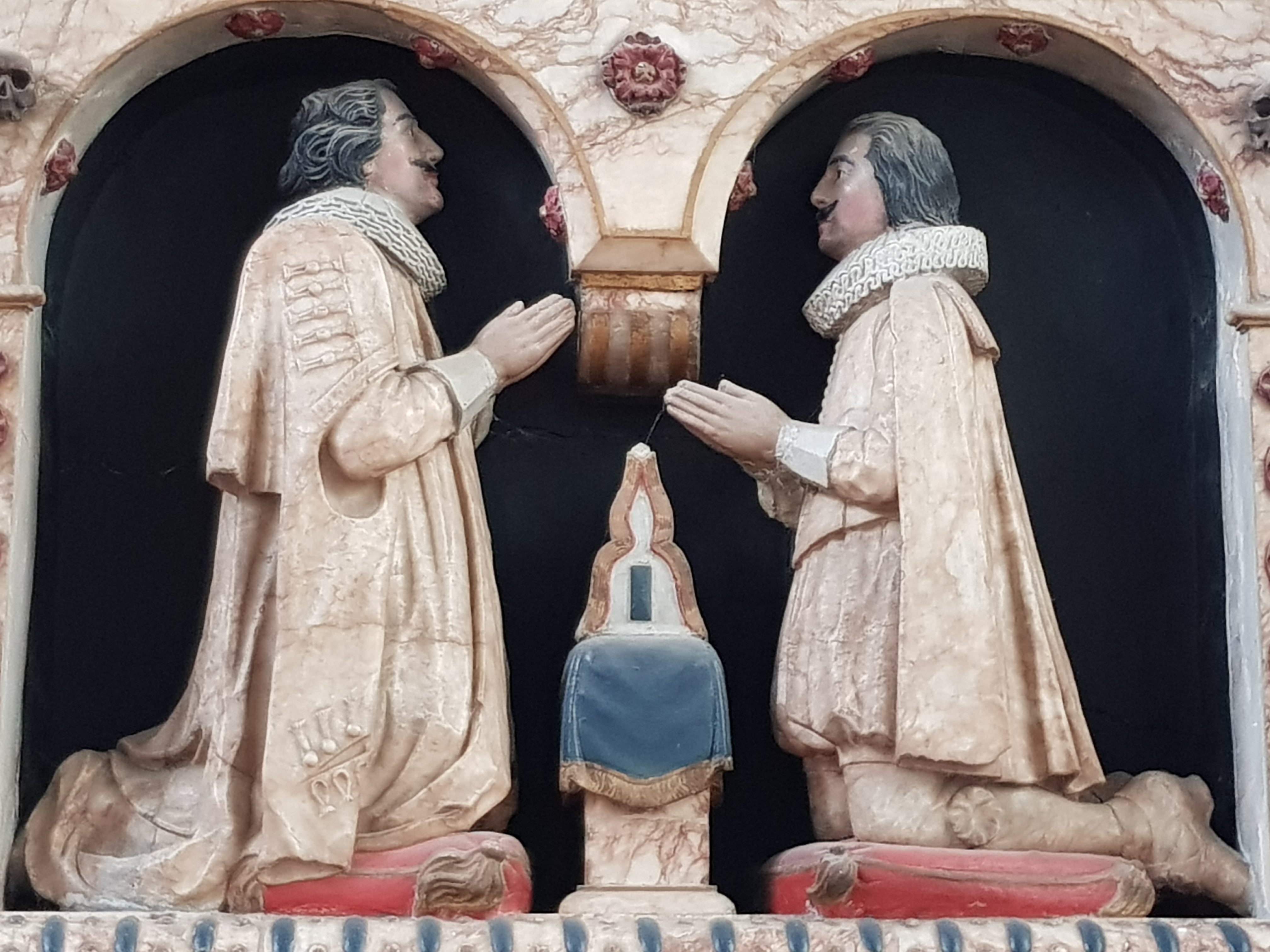 Inside, there is a fine early seventeenth-century tomb commemorating Jeffrey Pitman, kneeling above his wives and sons. These are the sons:-