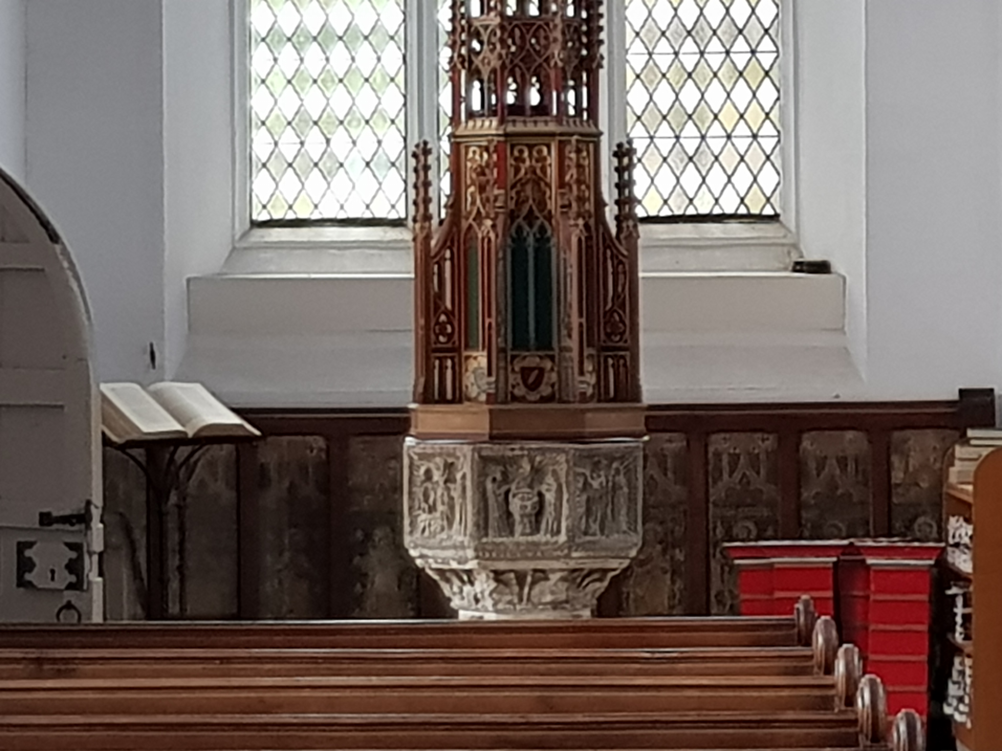 It’s well worth visiting Ufford next time you are up near Woodbridge. With modern road arrangements, it’s most unlikely that you would ever find it by chance, although so close. The greatest glory of Ufford church is its font cover: “It rises, six metres high, magnificent and stately, into the clerestory, enormous in its scale and presence. In all England, only the font cover at Southwold is taller. The cover is telescopic, and crocketting and arcading dances around it like waterfalls and forests. There are tiny niches, filled today with 19th century statues. At the top is a gilt pelican, plucking its breast”. Quote lifted from http://www.suffolkchurches.co.uk