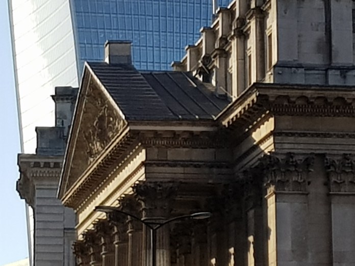 Having heard Peter Palumbo speak so eloquently earlier in the week about his experience of commissioning Mies van der Rohe to design a version of the Seagram building for Mansion House Square, I thought I should visit the exhibition on the subject at the RIBA. It starts with the original scale model demonstrating how Mies planned to open up a big square in front of Lutyens’s Midland Bank by demolishing not just the triangular site occupied by the 348 leasehold properties behind Mappin and Webb, but also the Magistrates Court opposite, which was originally built in 1873 as the National Safe Deposit Company, designed by John Whichcord, and later became the Bank of New Zealand:-
