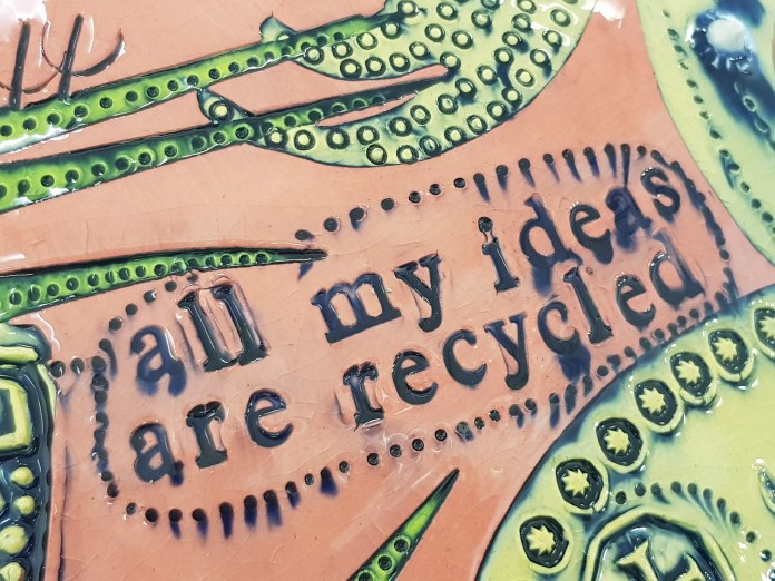 I went to see Grayson Perry’s exhibition The Most Popular Art Exhibition Ever !, which was indeed packed, thereby fulfilling his first aspiration of democratising the practice of fine art. I’ve always liked his work. It’s funny, ironic, playful and satirical, all of which are disparaged in much art practice, as he knows better than most. I haven’t always liked his tapestries, but very much admire his big Battle of Britain tapestry with its breadth of imaginative detail:-