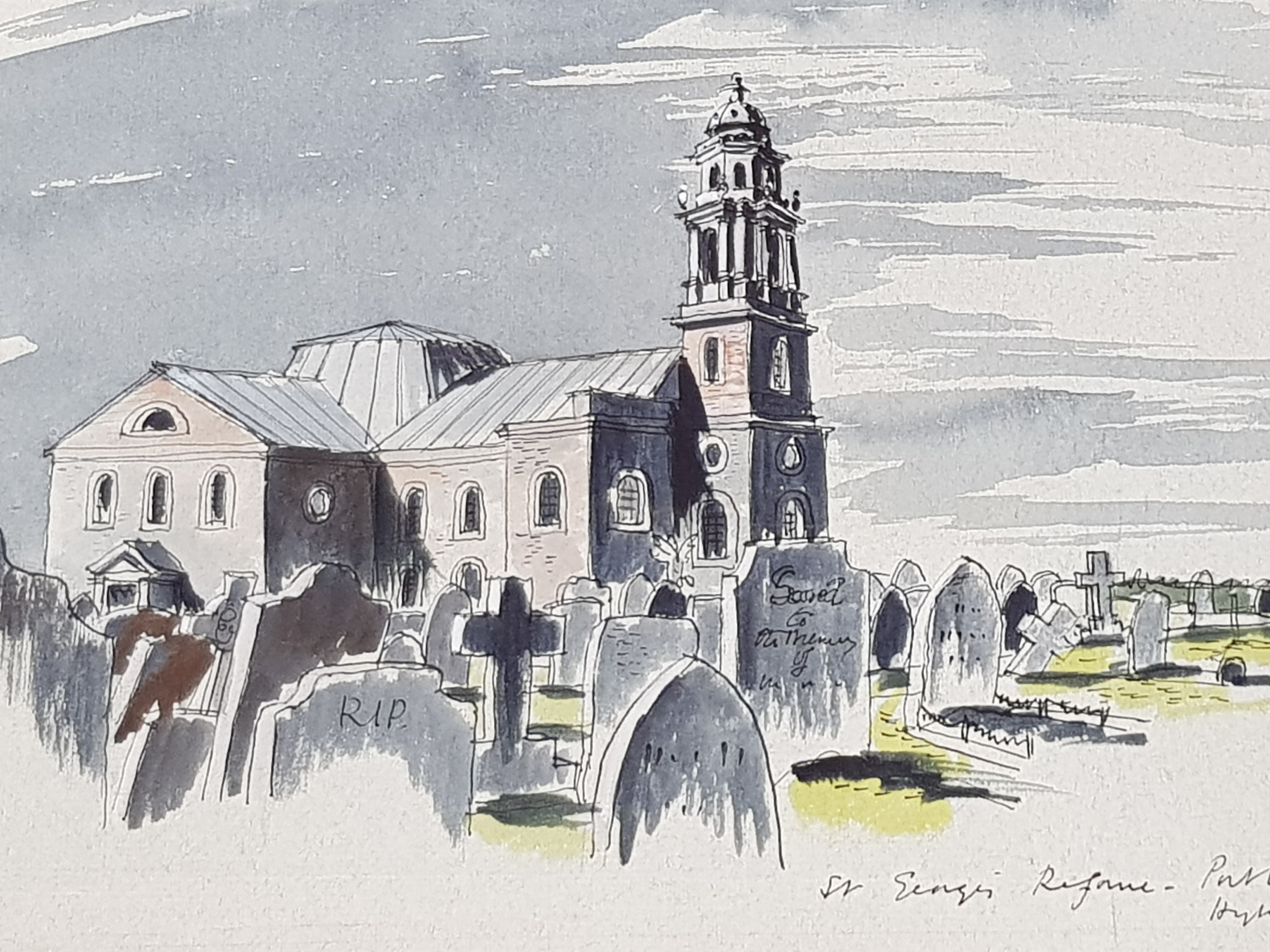 We had a meeting of our Collections and Library Committee and were able to celebrate the gift by his three daughters of nearly 100 sketchbooks by Hugh Casson PPRA, including a wartime sketch of St. George’s Church on Portland in Dorset:-