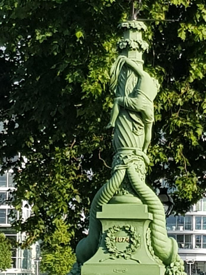 On Chelsea Embankment, a lampstand by the Coalbrookdale Iron Foundry (with glimpses of Norman Foster through the trees beyond):-