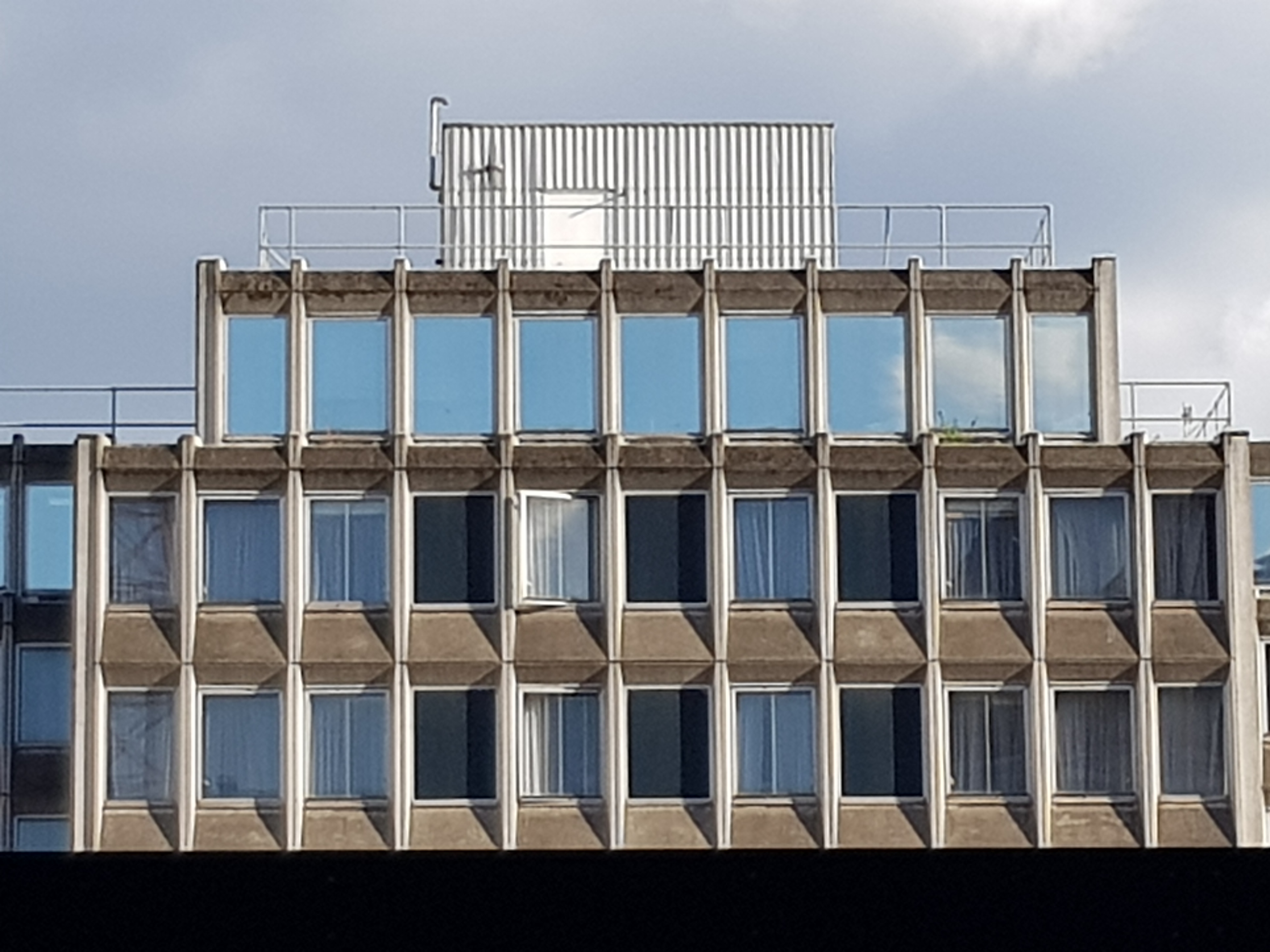 I had a slight frisson last night as I was walking across Leicester Square and spotted the top of the Trafalgar Hotel across a huge and vacant building site.   Described by Pevsner as ‘a period piece’, it was designed by Charles Pike & Partners in 1967.   Looks like a survival from Comintern:-