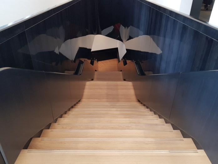 I went back to see the new Entrance Courtyard at the V&A, having missed its opening.   It’s pretty impressive:  grandly complex geometries inserted elegantly into the old Boilerhouse courtyard of which scarcely a trace remains;  a luxurious black lacquered staircase turning down into the deeply dug exhibition space which currently looks like an empty football stadium before the installation of the autumn Opera exhibition;  and then back by another black lacquered staircase which snakes up to the shop, producing an Escher-like effect, with an interesting light brought down into the basement.   Only one small lift.   What will happen when the lift breaks down ?   Otherwise, it’s all very spacious and impressive, creating good open public, as well as exhibition, space (the café is open till 9), and making it possible to appreciate the quality of Aston Webb’s detailing, newly scrubbed up.