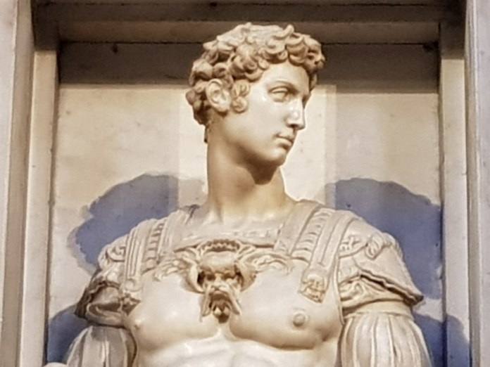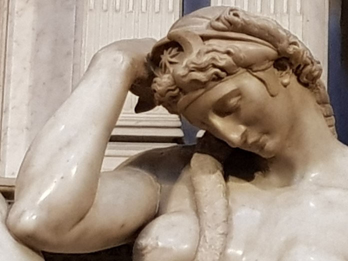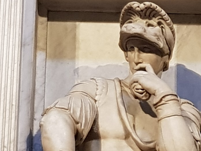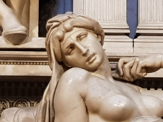 I was the first person in to the Medici Chapel, an early morning pilgrim before a morning flight, enjoying for a few moments before the other tourists arrived an opportunity to see and survey Michelangelo’s great tombs of Giuliano de Medici, Duke of Nemours, and opposite, Lorenzo di Piero de Medici, the Duke of Nemours, both so stately, symbolically composed, sitting alive above the lying statues of Night and Day or Dawn and Dusk, in the heart of a grand and balanced architectural composition, a great statement of funeral elegy:-
