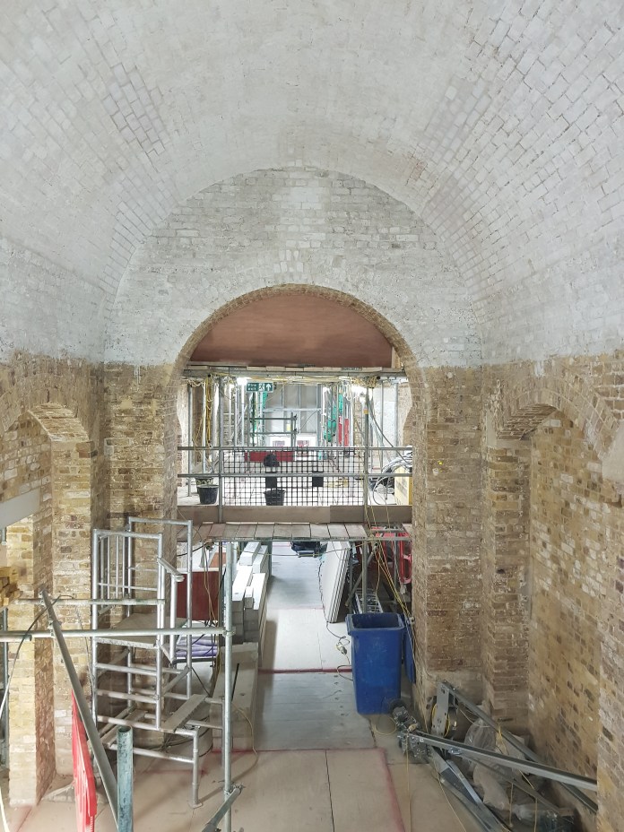 Every so often, there’s a moment of revelation in our building project when one realises that the end is finally in sight. Today was one of those moments, standing at the top of what were once the old garden steps and looking up into the lime-washed vaults: a realisation that David Chipperfield understood the quality of monumentalism which would be achieved once the original floor level was dropped:-