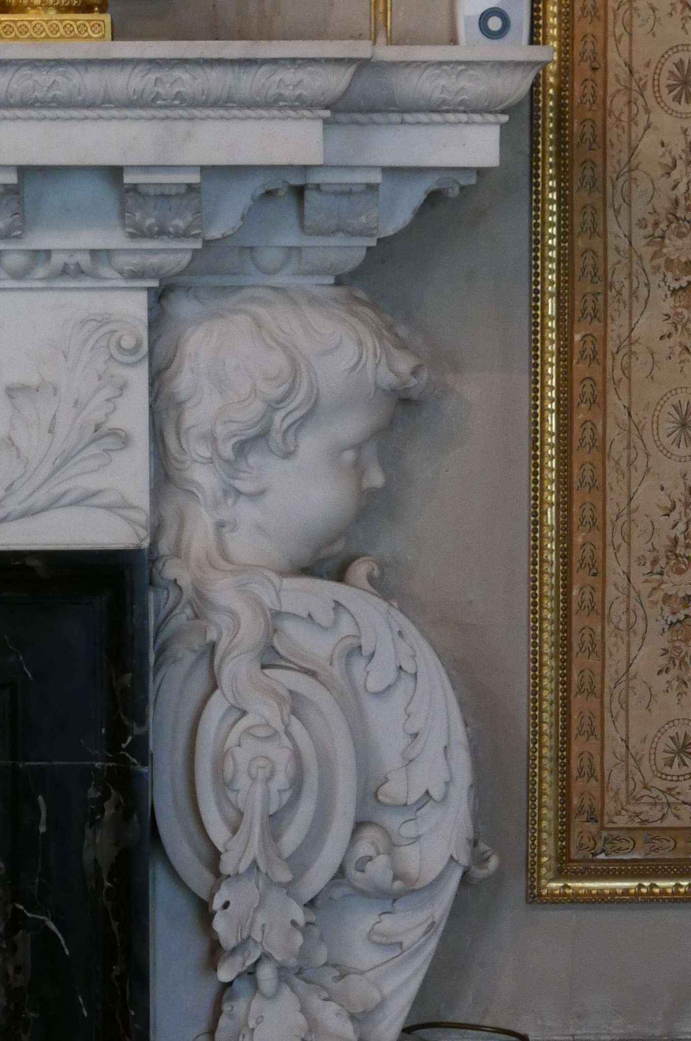 Through the Saloon is the White Drawing Room with a chimneypiece of Aurora, flanked by Caryatids:-
