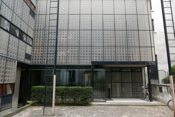 En route to Paris, I had luckily spotted that the Sciences Po is right next door to the Maison de Verre and that, since it was bought in 2006 by an American commodities-trader, it has generally been open on Thursday afternoon. So, at five o’clock precisely, I was granted temporary admittance to the courtyard which contains Pierre Chareau and Bernard Bijvoet’s glass facade, erected between 1928 and 1932 for Dr. Dalsace, a gynecologist, who had his offices on the ground floor. Although Dalsace was a medical practitioner, he also knew intellectuals, so I liked to imagine Walter Benjamin standing where I stood in 1934:-