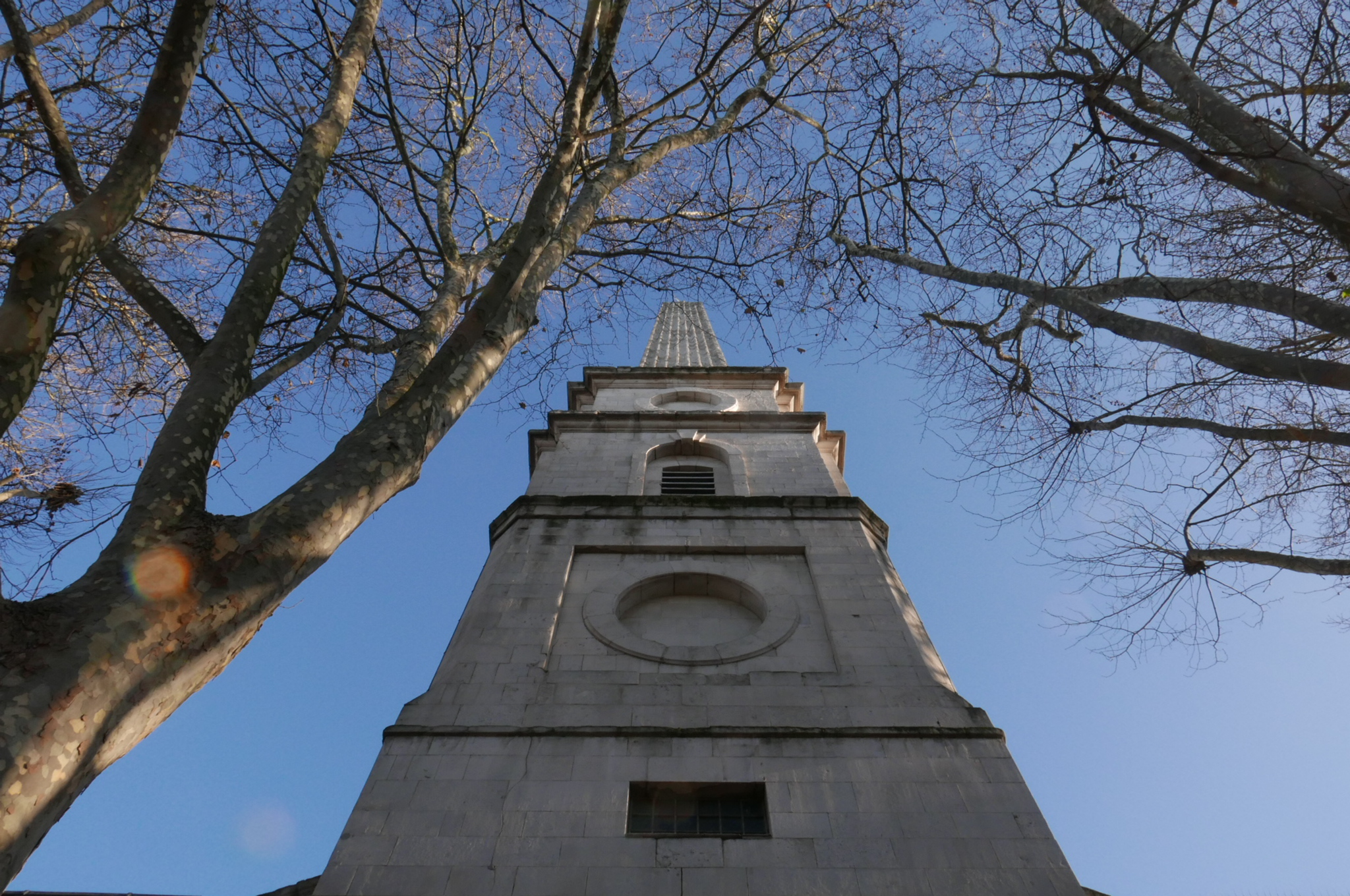 From Bunhill Fields, I walked past St. Luke, Old Street, one of the Fifty New Churches, with a nave thought to be by John James, but with an obelisk and west tower by his colleague, Nicholas Hawksmoor:-