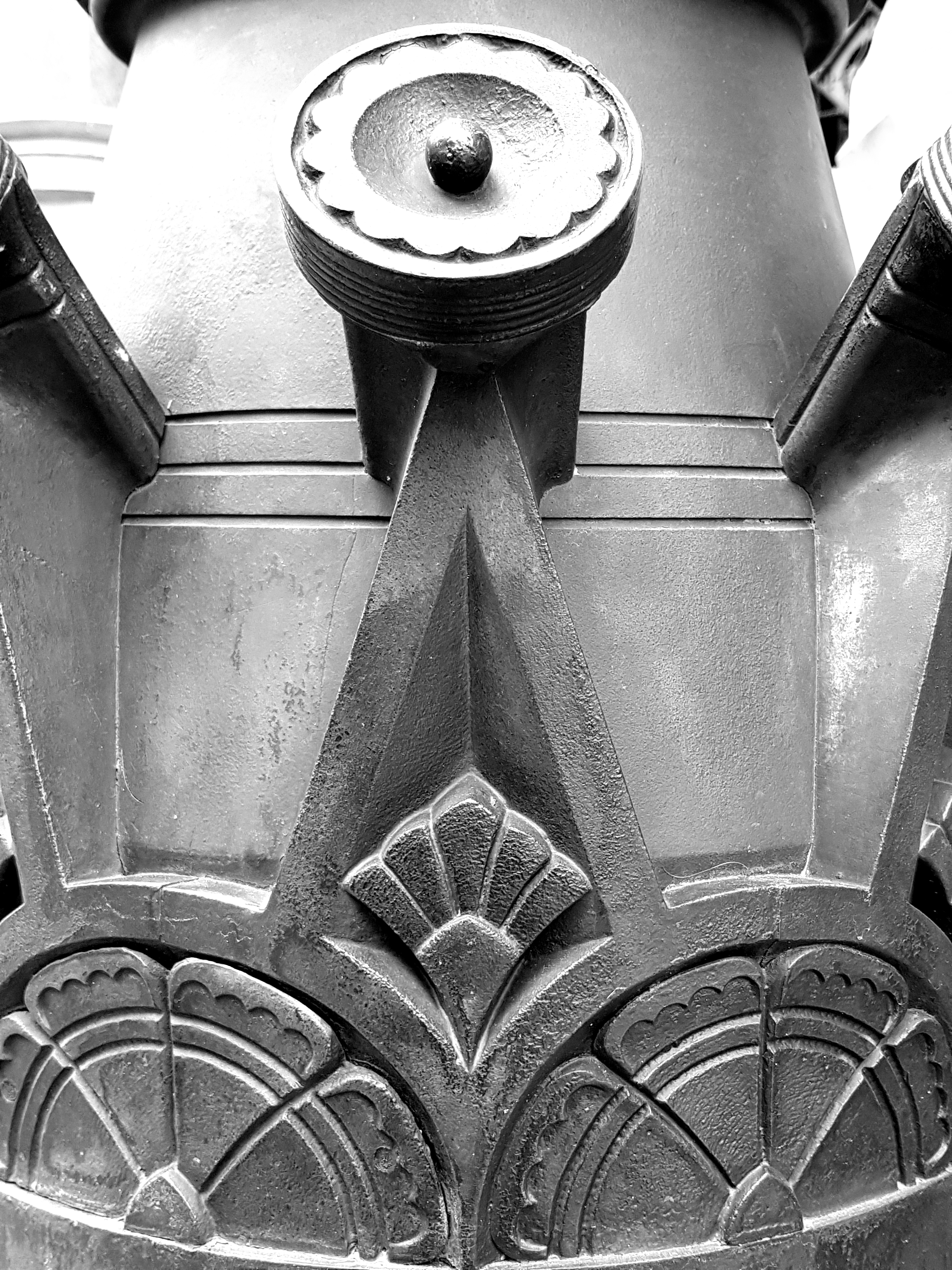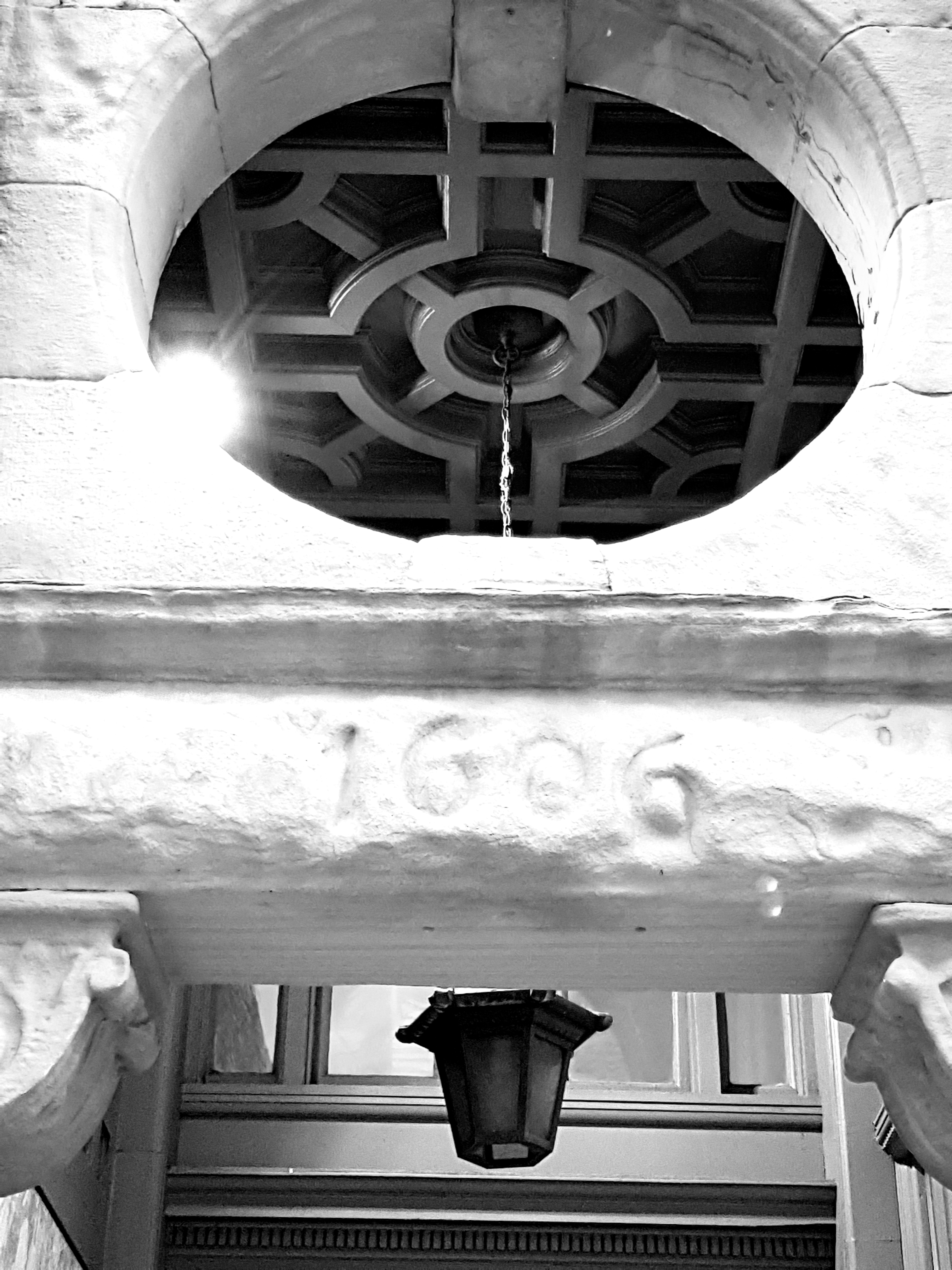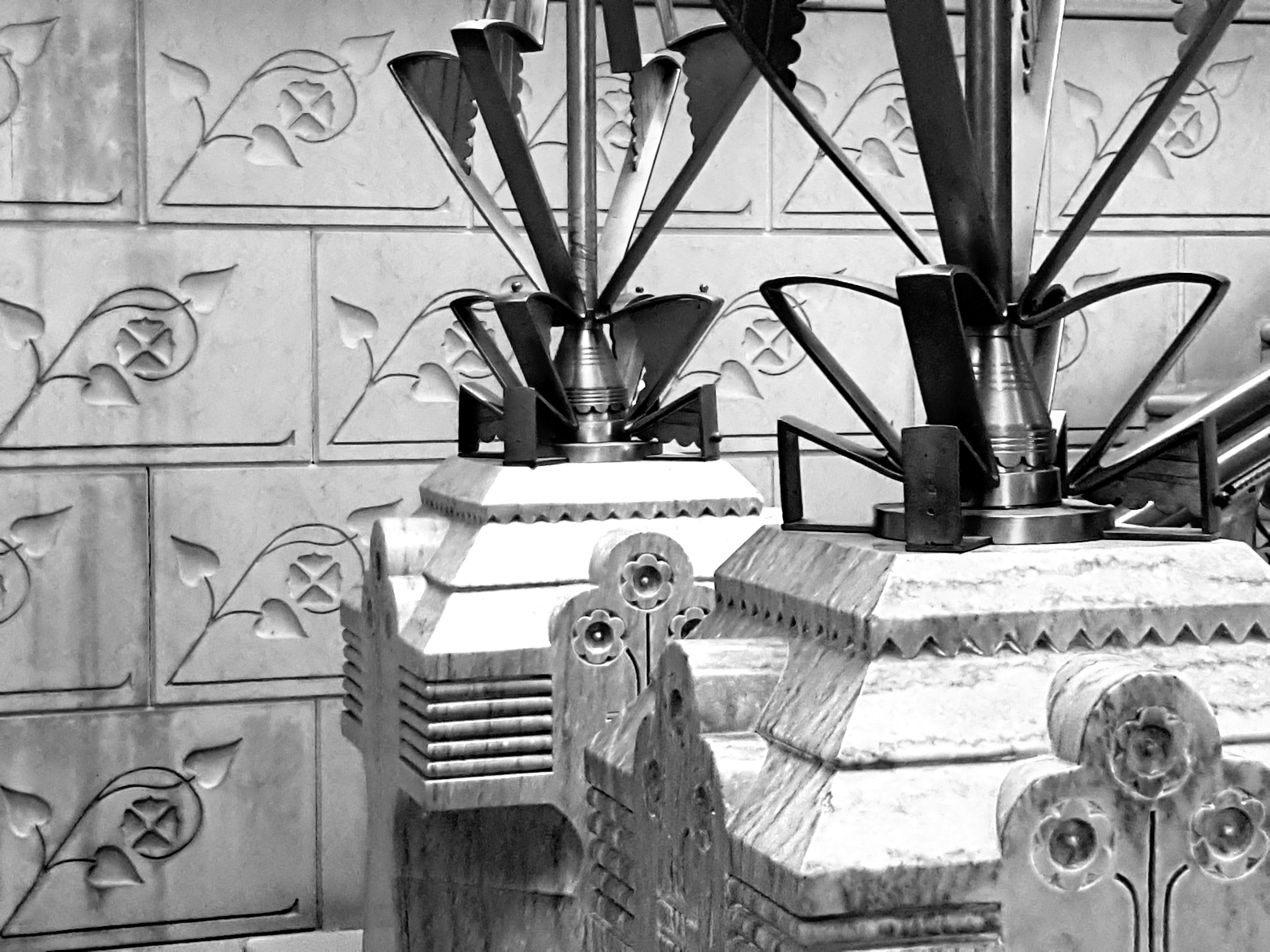 Inside, I admired the beautiful, early Arts-and-Crafts lamps and the richly carved staircase hall:-