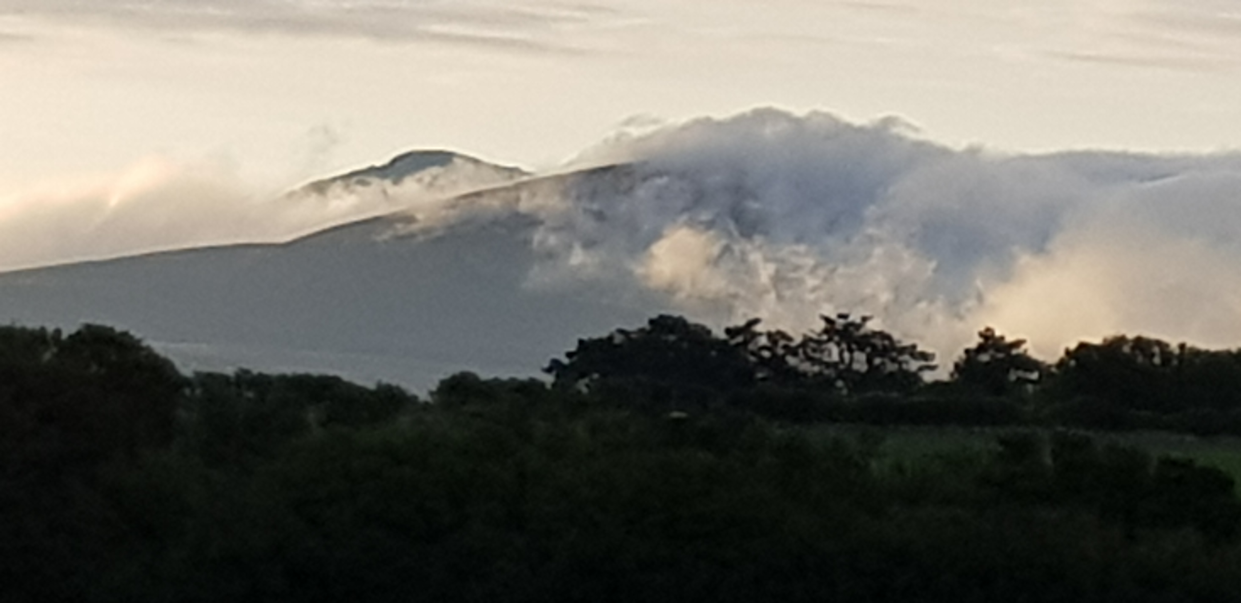 It’s not often that we can see the summit of Snowdon quite so clearly, hovering mysteriously behind the conical shape of Moel Eilio, which this morning is swathed in cloud:-