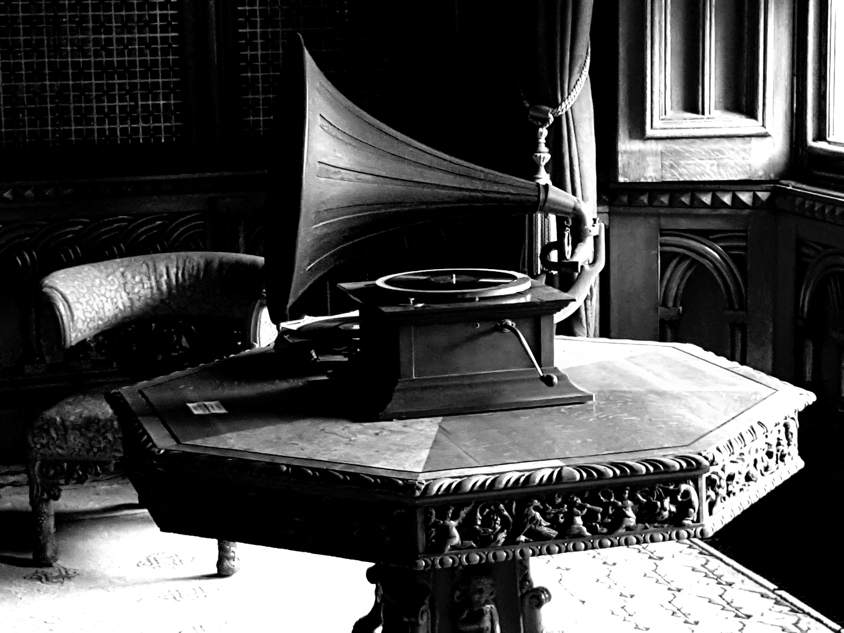 Next door, the library is equally impressive, with its elaborate carved chairs and slate gramophone:-