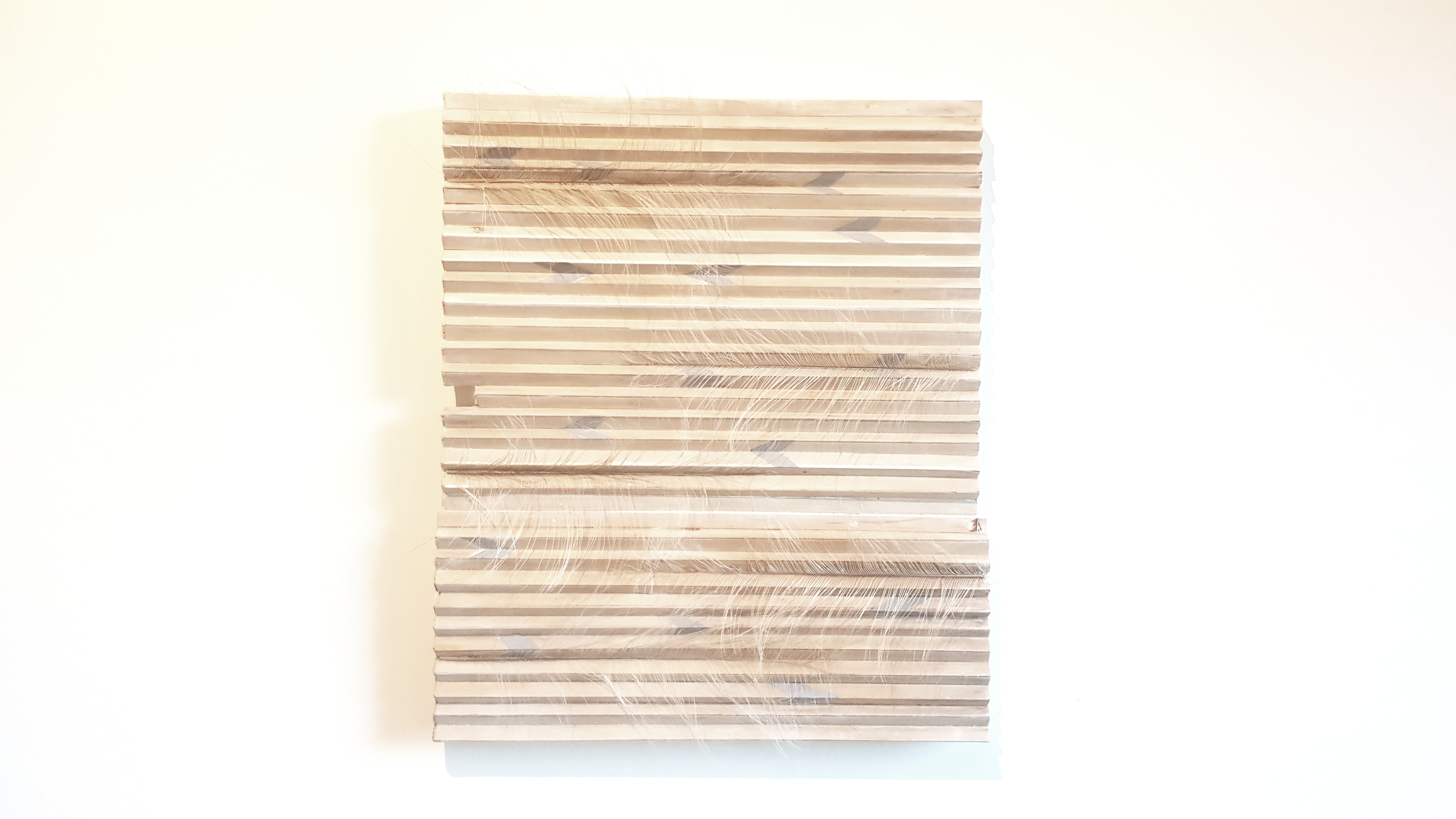 The exhibition itself is full of very beautiful work, some using carved English alabaster, one, Darts (2014), using bleached pheasant feathers mounted onto ridged plywood and painted chevrons:-