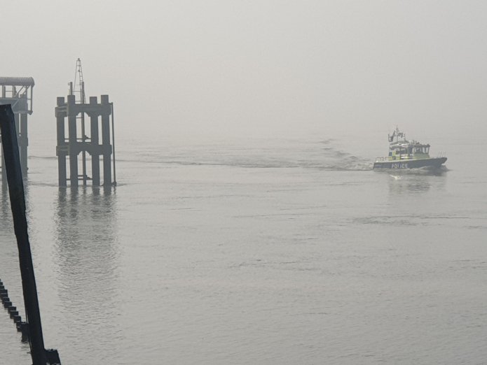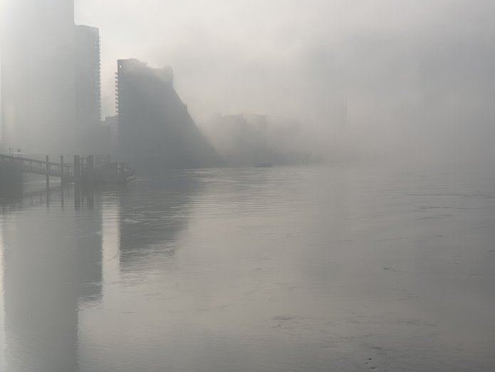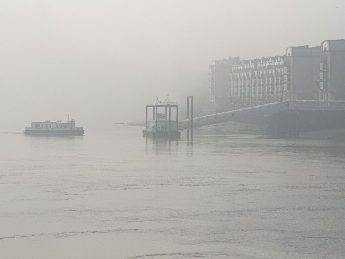 I have seldom seen it so misty as it was down by the river this morning – the buildings of Canary Wharf and its surroundings swathed in cloud and tug boats, a police launch and the ferry in the distance:-