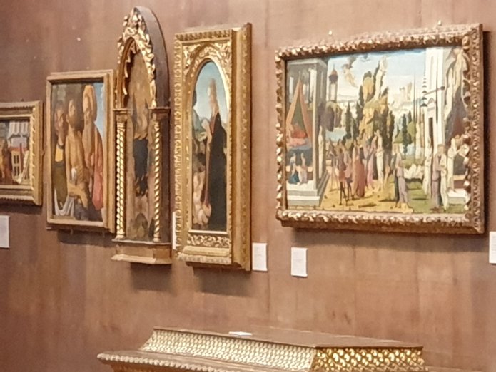 Gallery VI is the Upper Marlay, a wonderful gallery space, added by Sydney Cockerell in 1921 to designs by Arnold Dunbar Smith of Smith & Brewer, who Cockerell would have known through the Art Worker’s Guild. The early Italian pictures are hung on a background of Japanese gold wallpaper, like a jewel casket:-