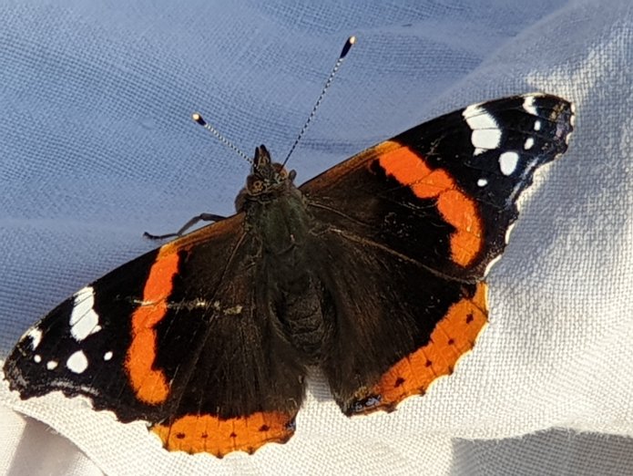 But there was a beautiful Red Admiral which liked the whiteness of Romilly’s dress:-