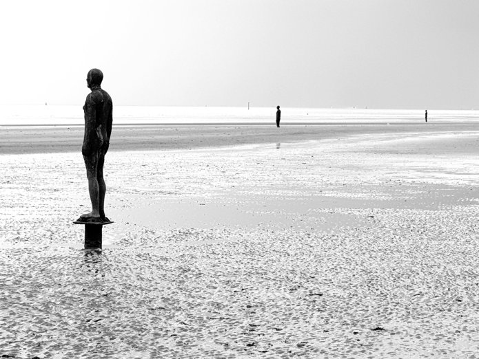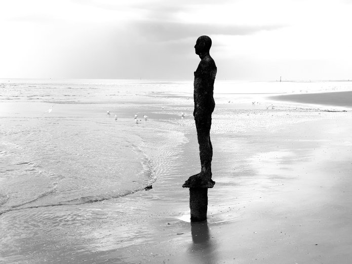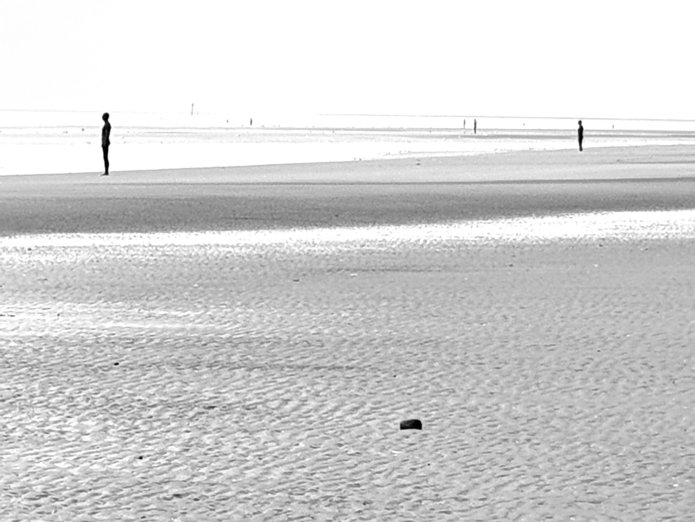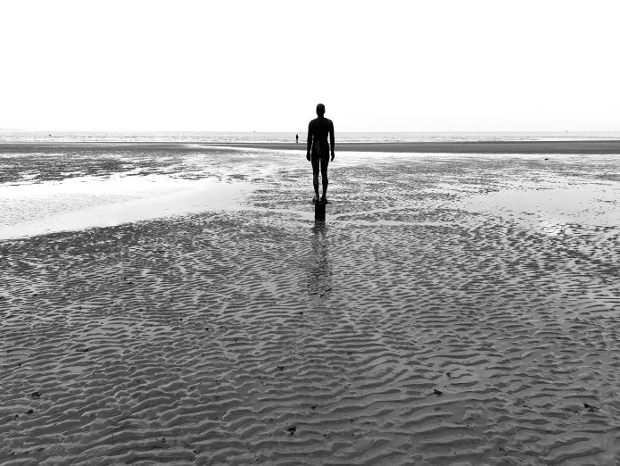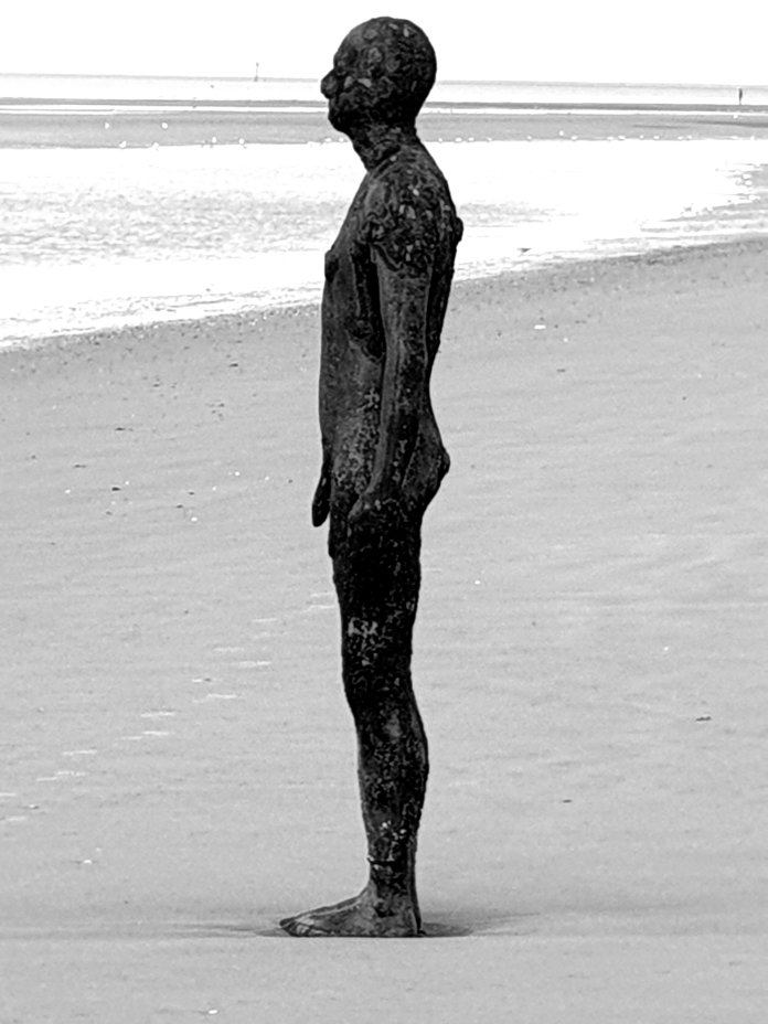 In preparation for the great Antony Gormley exhibition which opens at the RA on September 21st., I stopped off at Crosby Beach where he installed a set of monumental sculptures in 2007 (I didn’t see them all). I found them strangely moving, standing in the face of the incoming tide, looking out west towards the coast of North Wales, they are magnificently calm and immobile, sentinels waiting for what one knows not quite what: some form of the end:-