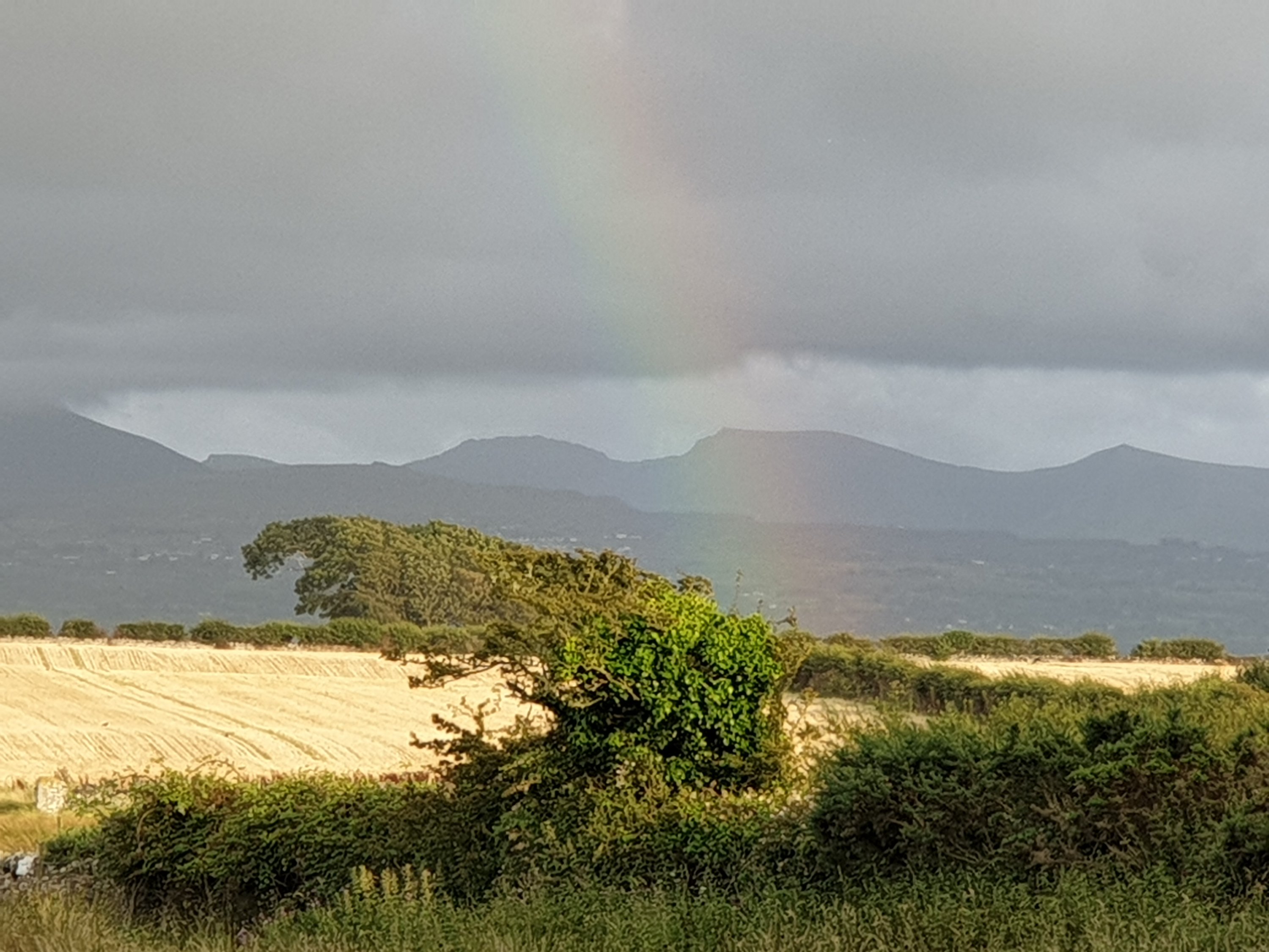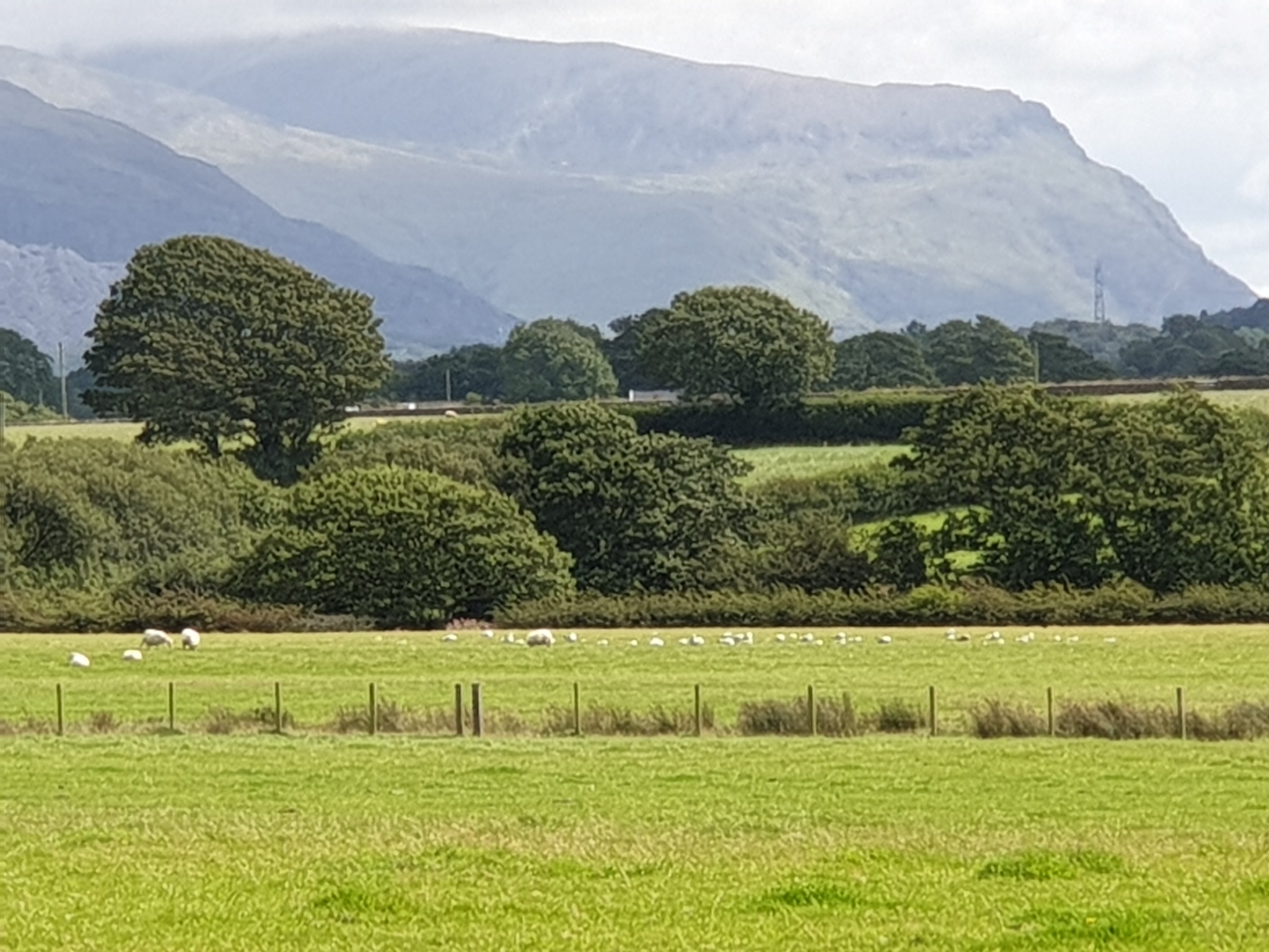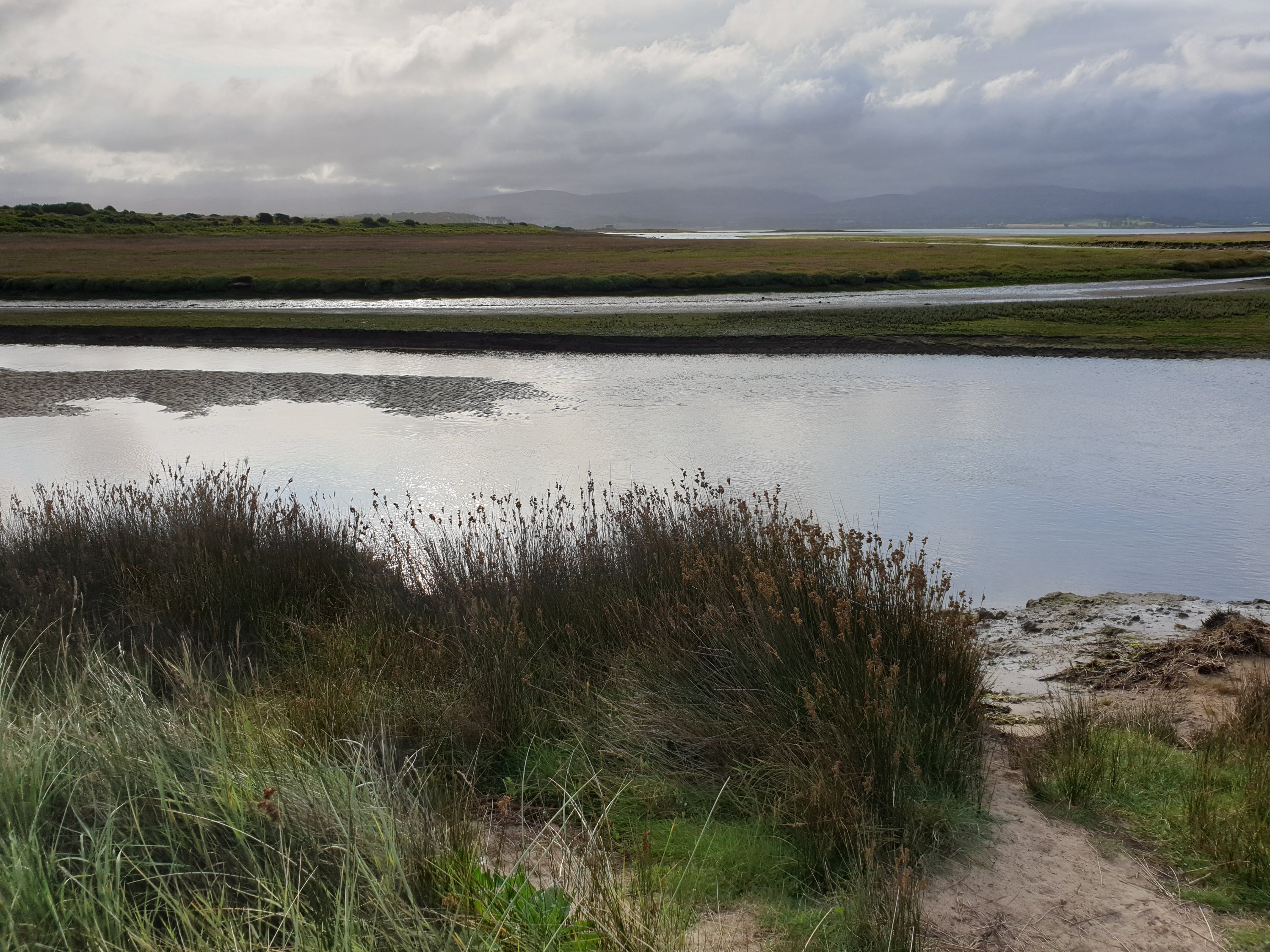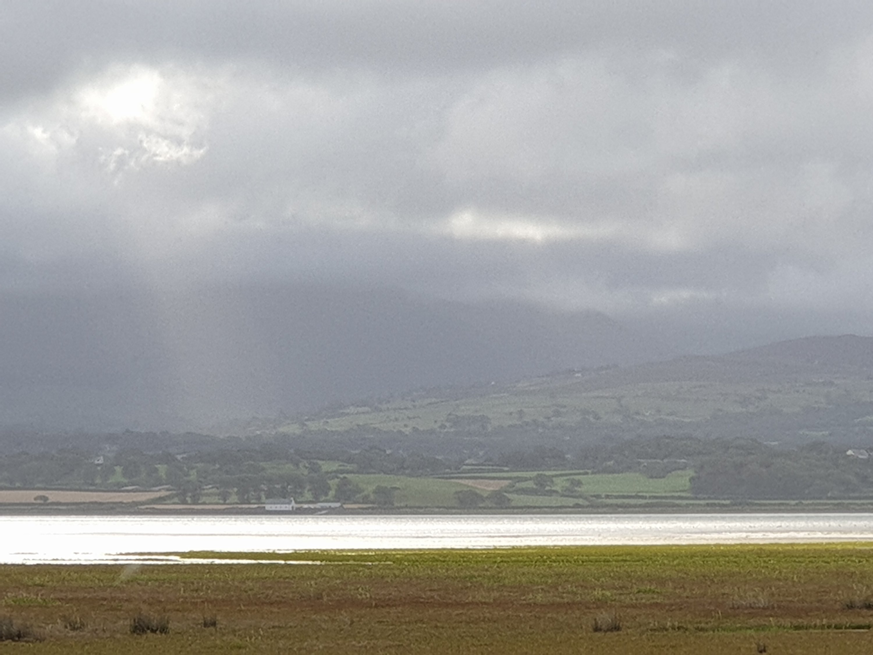 We walked down to the sea this morning along the side of the estuary – it was high tide with distant bright, scudding light illuminating the low hills and fields on the other side of the Straits:-