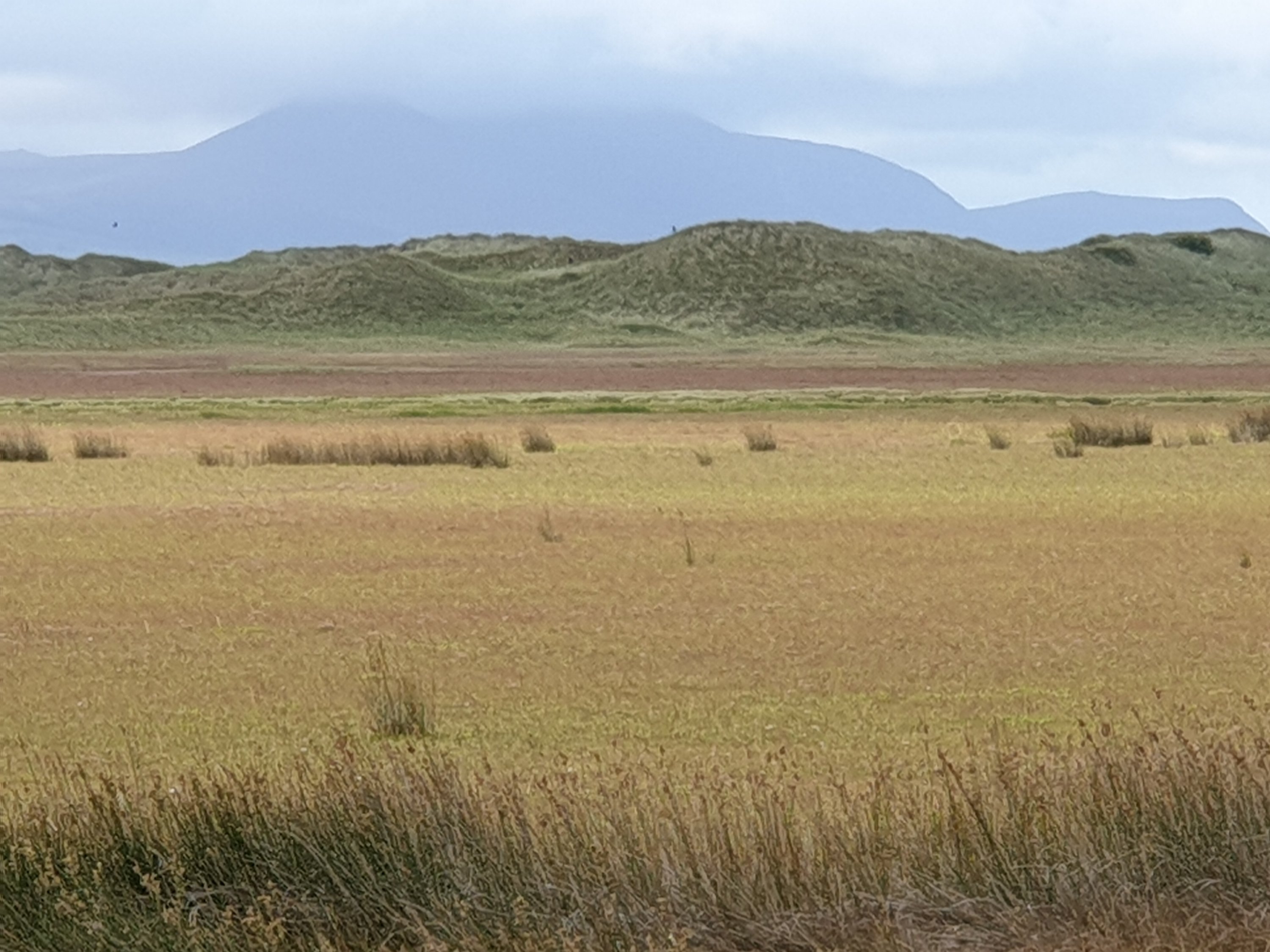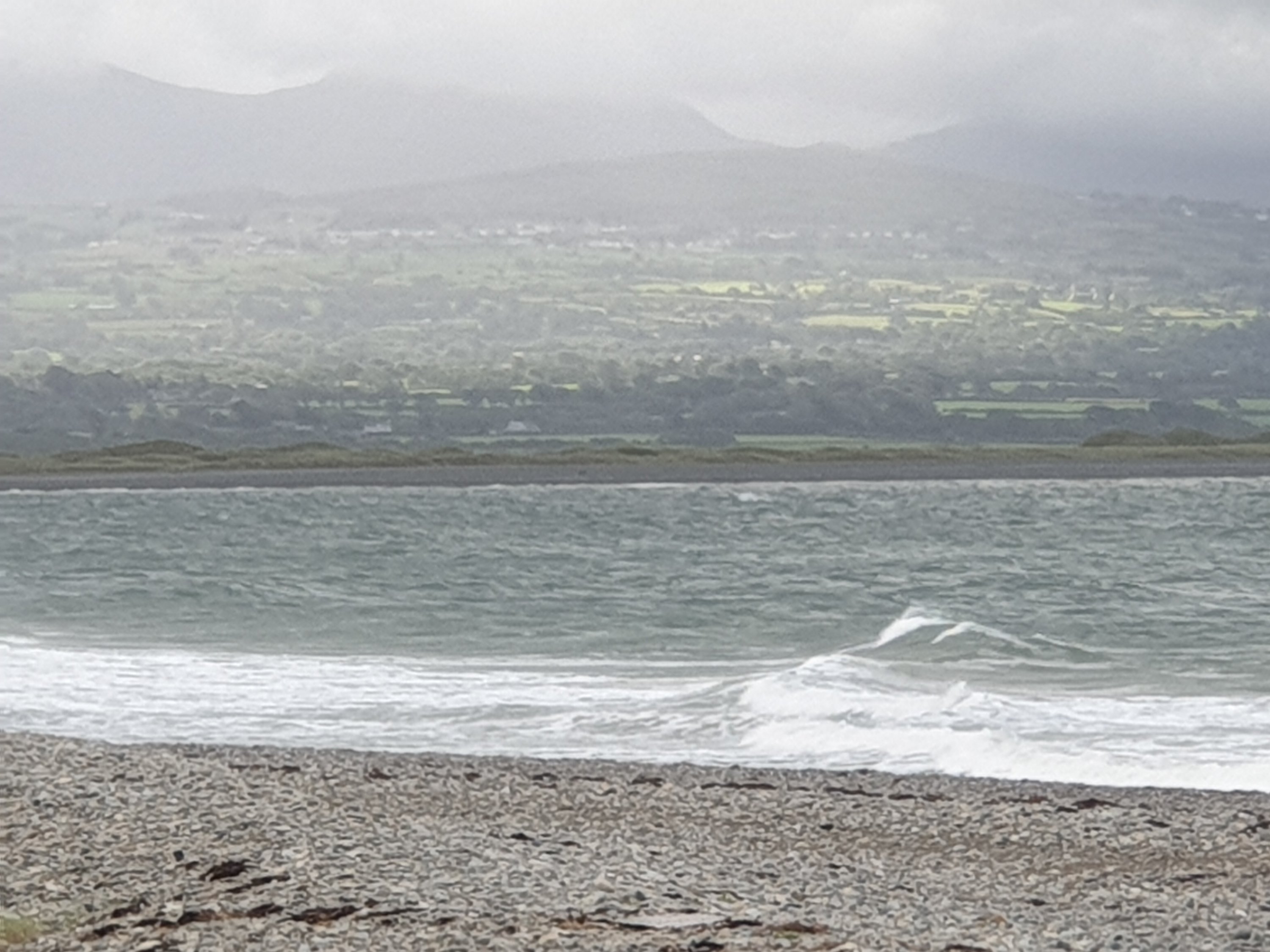 We went to the beach at Rhosneigr, the only place we have found where you can take a wheelchair down to the sand. It was wild and windswept, with masses of surfers in the waves:-