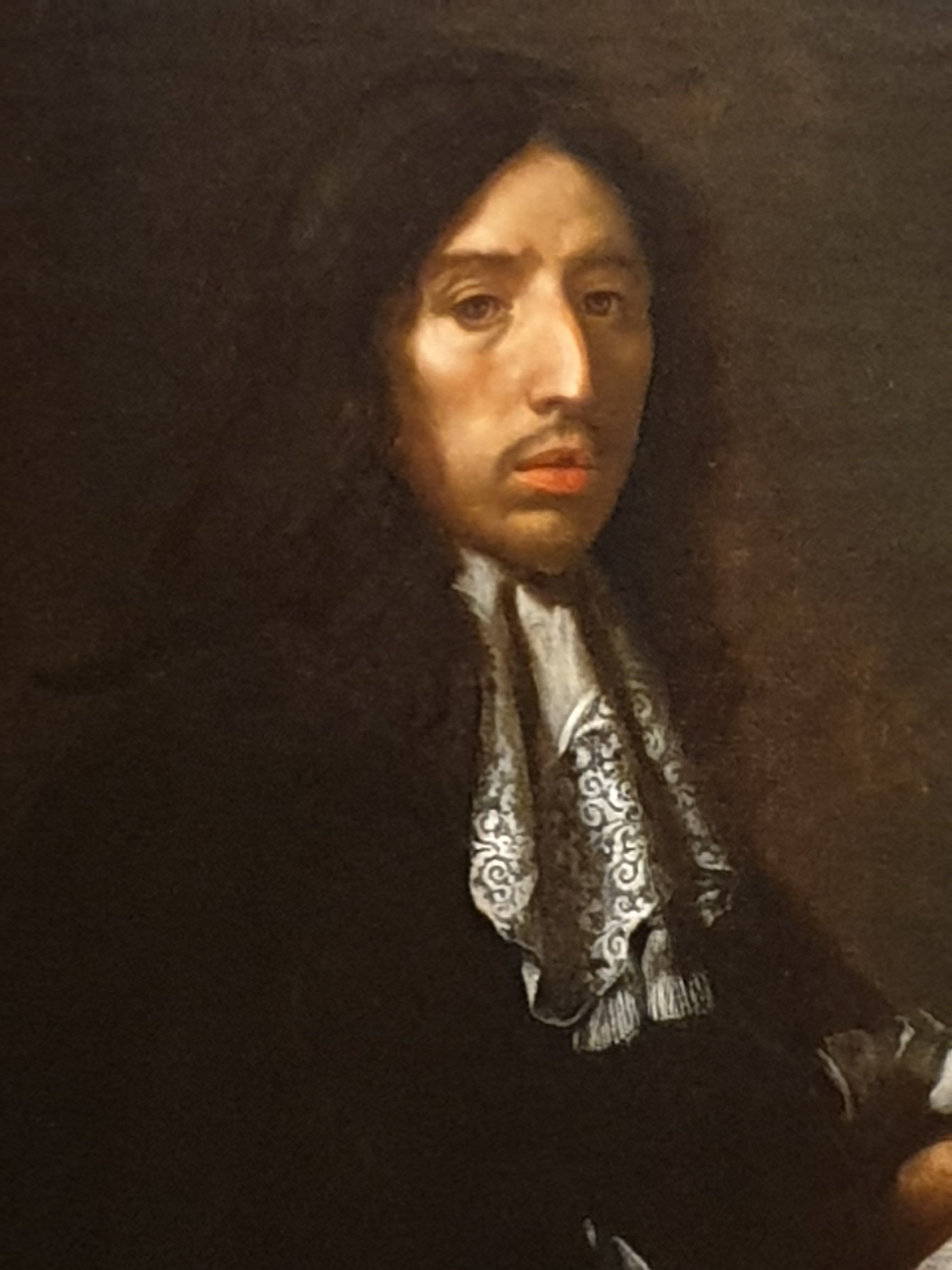 In 1848, when the Museum was first opened, the gallery was hung floor to ceiling. Sydney Cockerell added a balcony for the display of drawing. When Michael Jaffé became Director in 1974, he hung it with tomato coloured silk. Now it has been hung with a more sober and darker coloured purple fabric (they call it maroon). Anyway, it looks very fine and the ceiling has been converted from a colour which Luke Syson described in his speech as somewhere between toenails and a pub saloon to a more pristine white. It’s a suitable setting for the Gallery’s amazing collection of seventeenth-century portraits, including Carlo Dolci’s portraits of Finch and Baines:-