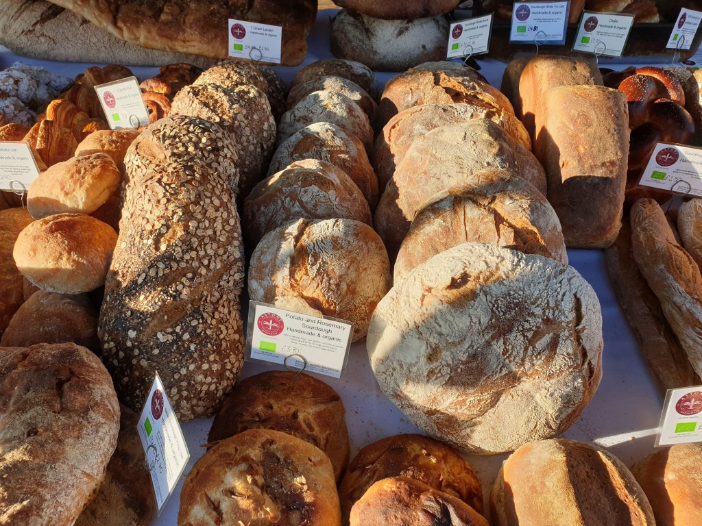 I fell into conversation this morning with the man who sells bread at Stepney Farmer’s Market. I had always assumed that he baked it himself as he is often late setting up his stall, as if he he has only just managed to extract himself from the oven. But, no, it comes from an industrial estate in Inkpen on the Berkshire Downs, made by Syd Aston of Aston’s bakehouse and supplied to farmer’s markets all over London. I’m not complaining: it’s very good:-