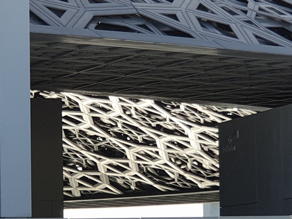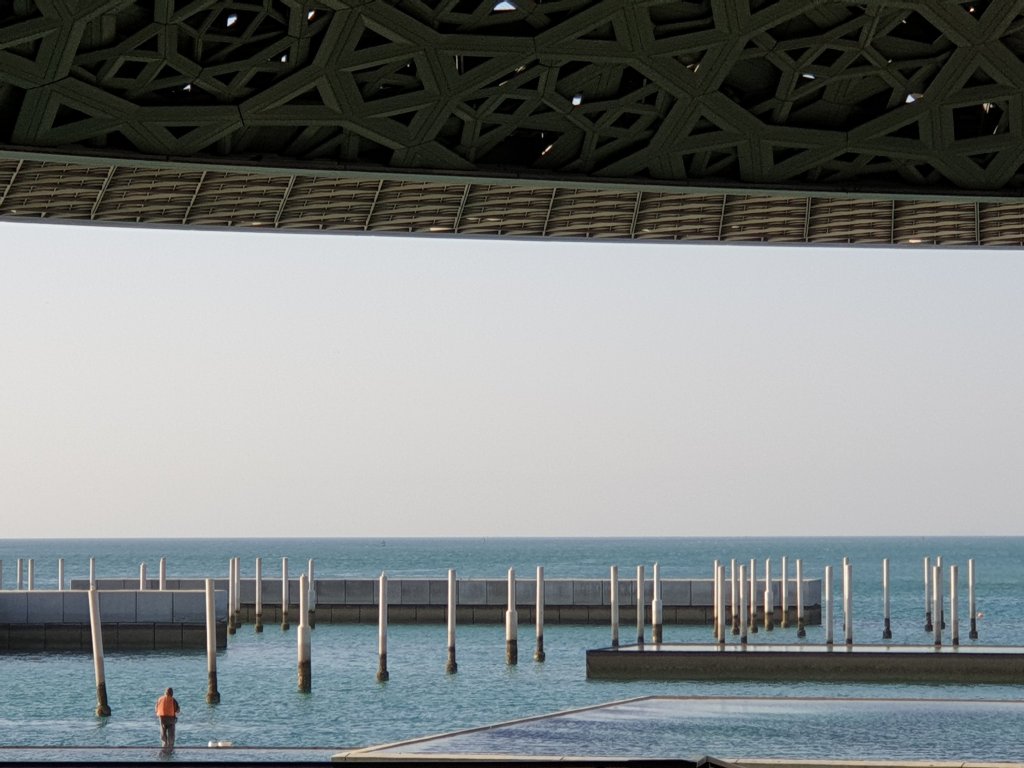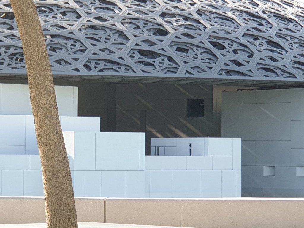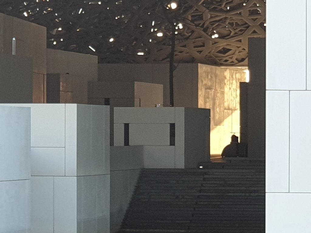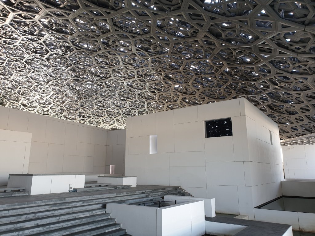 I have just had the briefest, but most exhilarating introduction to the treasures of the Louvre Abu Dhabi, first of all to Jean Nouvel’s astonishing interiors – more interesting inside than outside because you get a sense of the depth of the shallow dome and the way in which light plays through it:-
