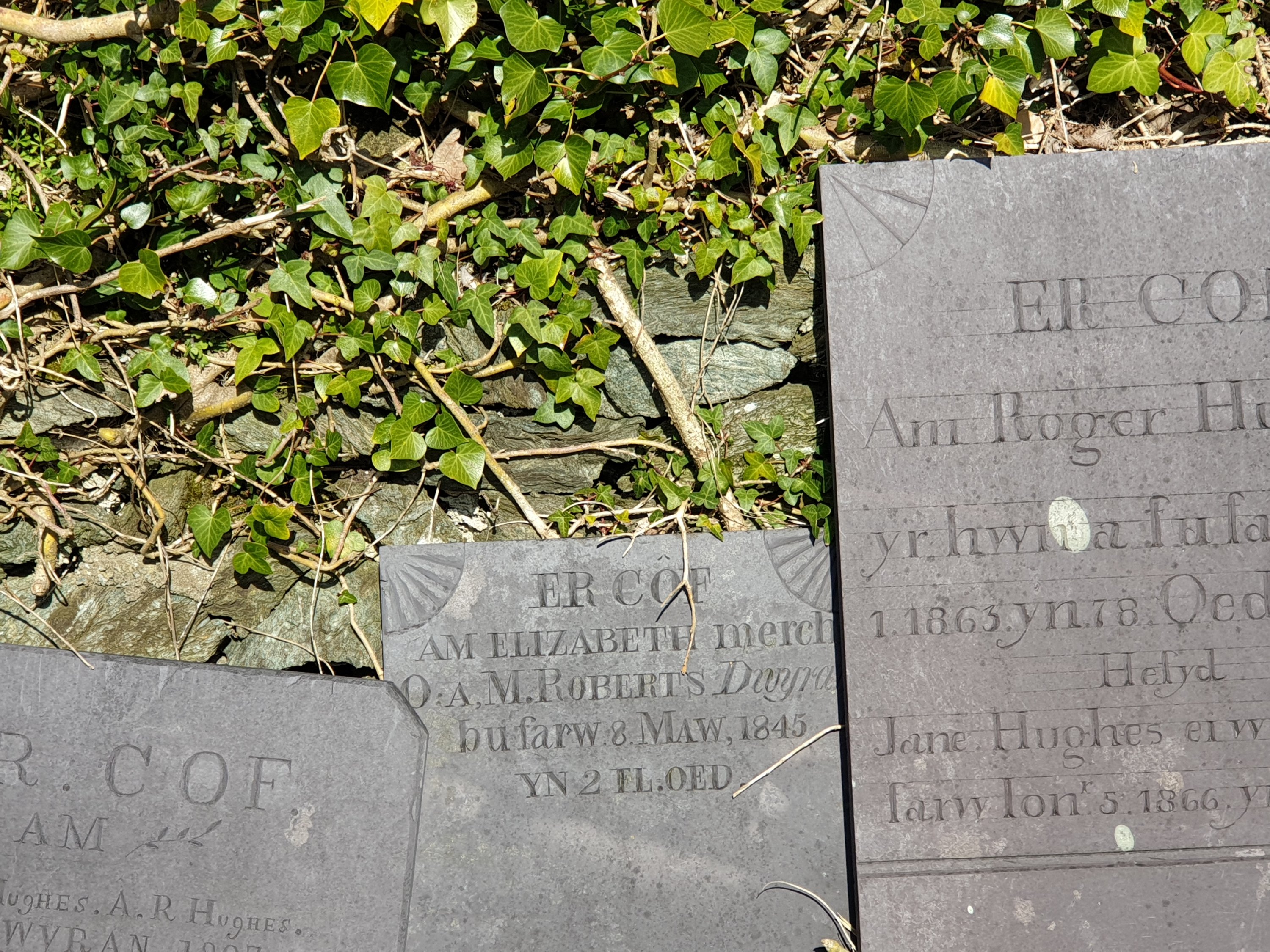 I’m just reviewing the photographs taken on today’s constitutional, which was slightly longer than usual, taking in the churchyard of St. Ceinwen, Llangeinwen with its slate tombs:-