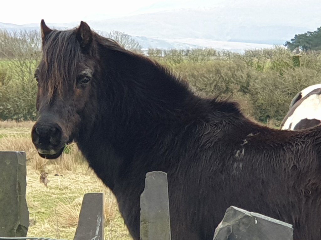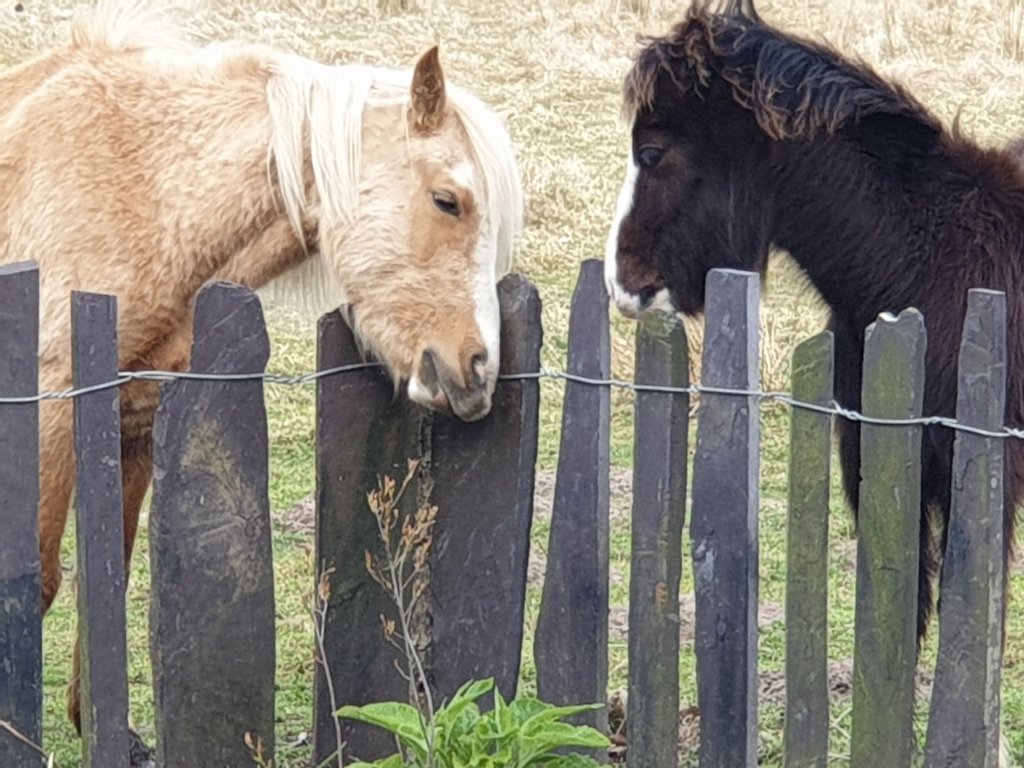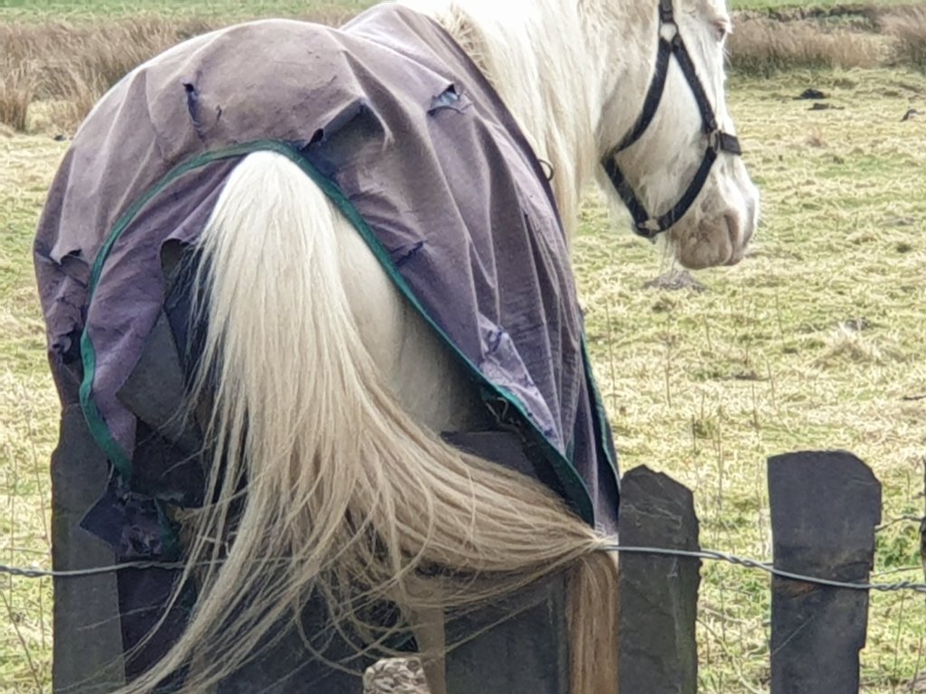 The horses in the adjacent field have discovered that our slate fence is the perfect thing on which to scratch their itches, so we have a good view of them all day long:-