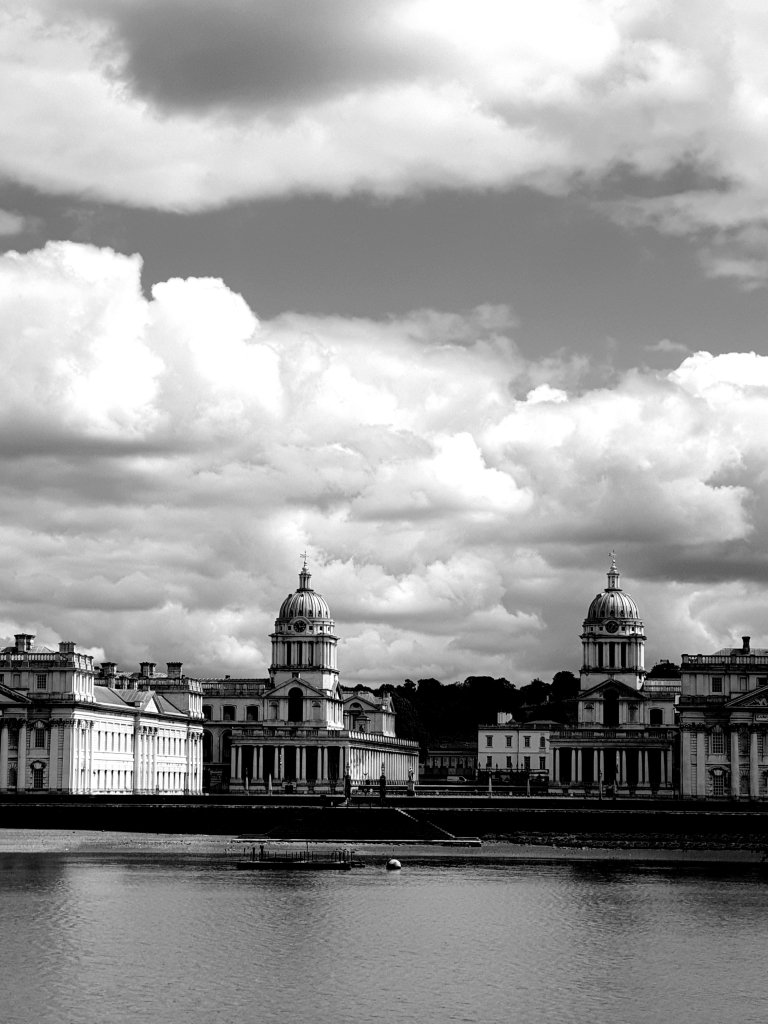For us, the nearest place we can get even a sense of the sea – seagulls, mudflats and open water – is in Island Gardens, the park at the bottom of the Isle of Dogs where the foot tunnel goes from, but the lift is not working, and one can look across the Thames to the noble accumulation of fine buildings on the other side, with the Queen Anne Court in the afternoon sun. It was designed by Wren and Hawksmoor to replicate the work of Webb to the west, begun in 1698, financed by the proceeds of a state lottery:-