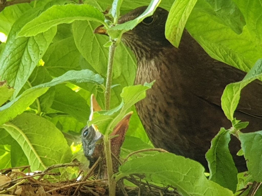 This morning, there was one of the baby blackbirds waiting to be fed:-