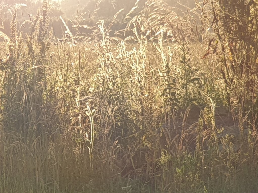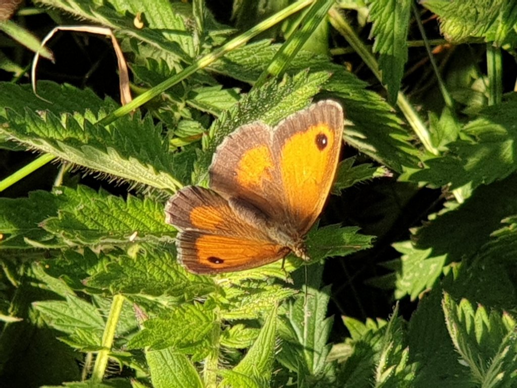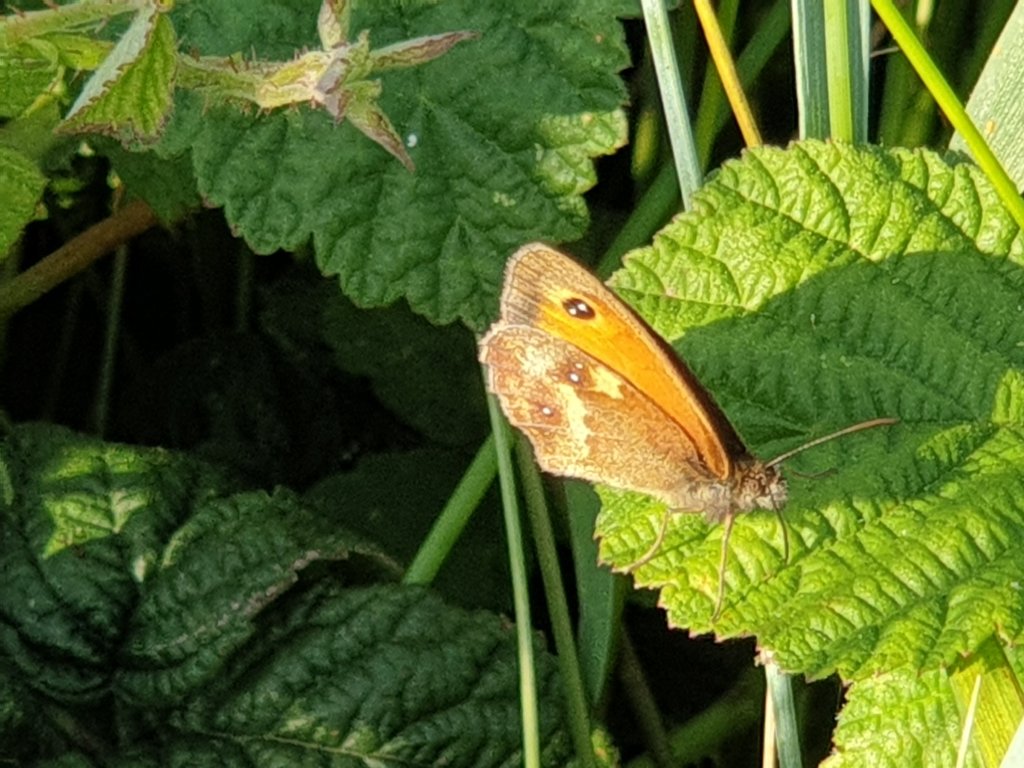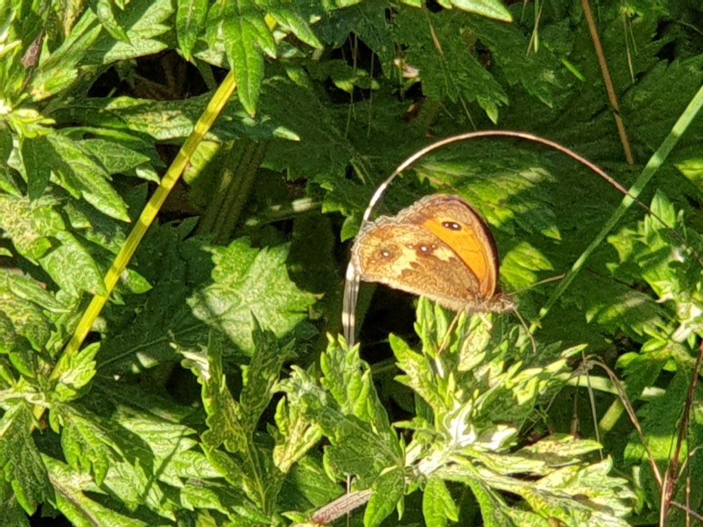 Walking down the lane this evening, the hedgerows are absolutely full of butterflies, all the same type – I think Gatekeepers, but am happy to be corrected: hard to photograph, particularly with their wings spread. Maybe it is the sun:-