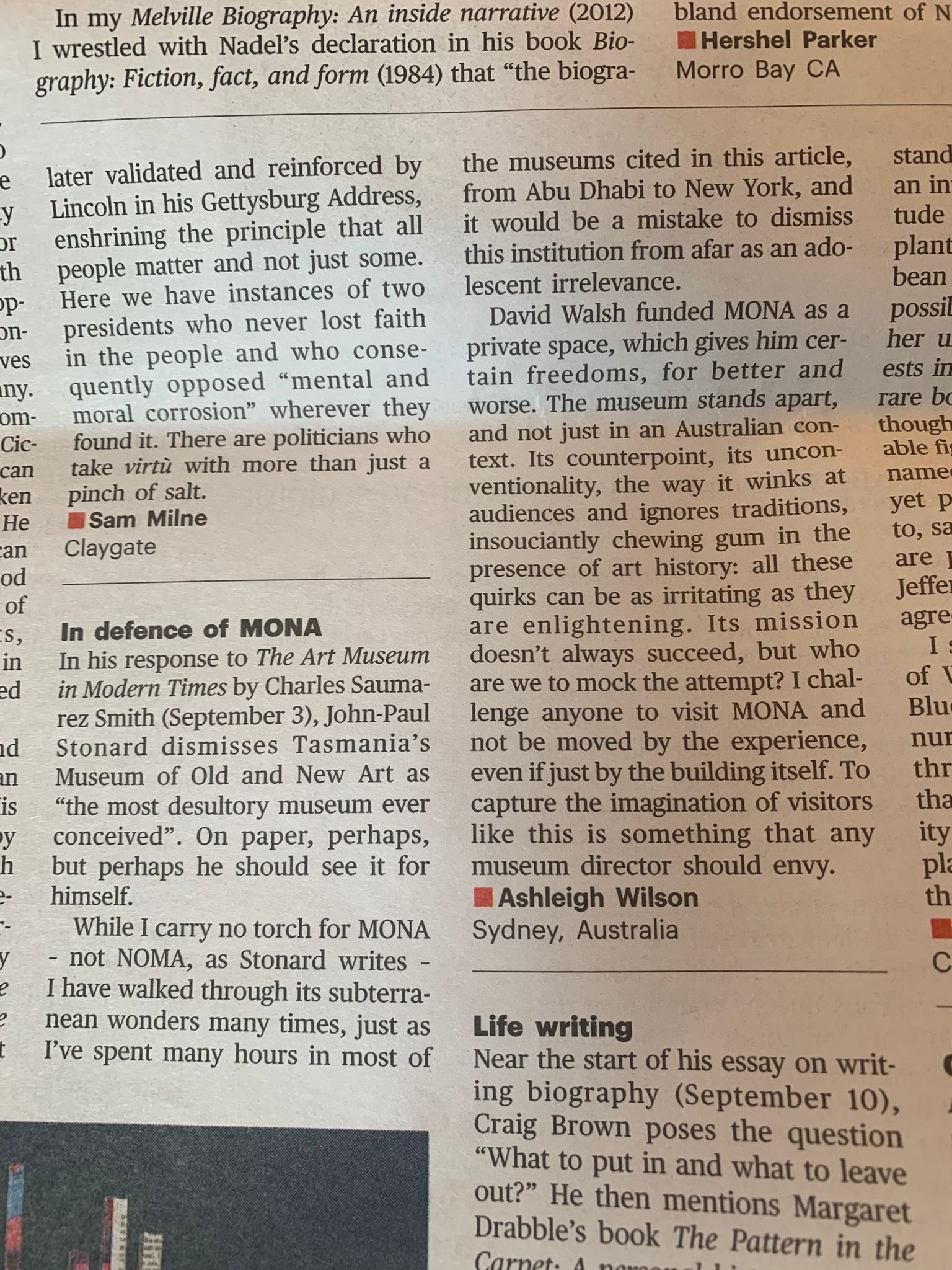 I have been sent a copy of a letter which has been published in this week’s TLS. I completely agree with it. I sometimes got the sense that David Walsh was trying to irritate the hell out of people like me by designing his museum MONA so wilfully unconventionally. But like Ashleigh Wilson, the author of the letter, I enjoyed and admired its provocative unconventionality, which has obviously succeeded in attracting new audiences.