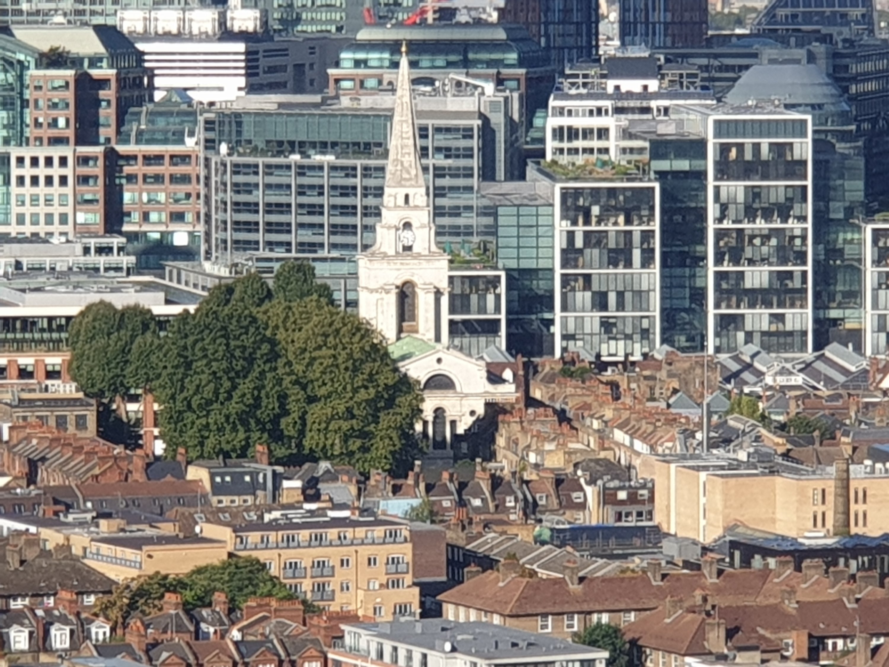 Christ Church, Spitalfields barely holds its own against the new Tower blocks:-