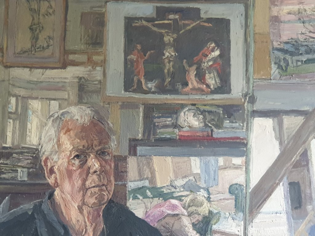I have found it an interesting experience, partly because it is such a pleasure to live with pictures and get to know them better, the test of a good picture being how far and in what way it survives prolonged scrutiny – and I can’t help but notice how some people spend a long time in the room figuring out the quality and character of the paint surface, particularly with his largest and most ambitious recent work, Self Portrait with Grünewald and Two Geese, which has layers of complexity in terms of his depiction of the geese, his use of mirrors, and the relationship of sitter to his surroundings.