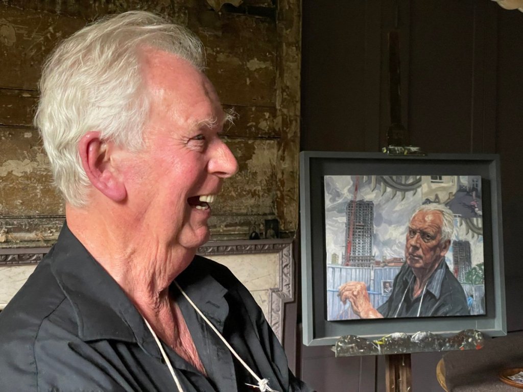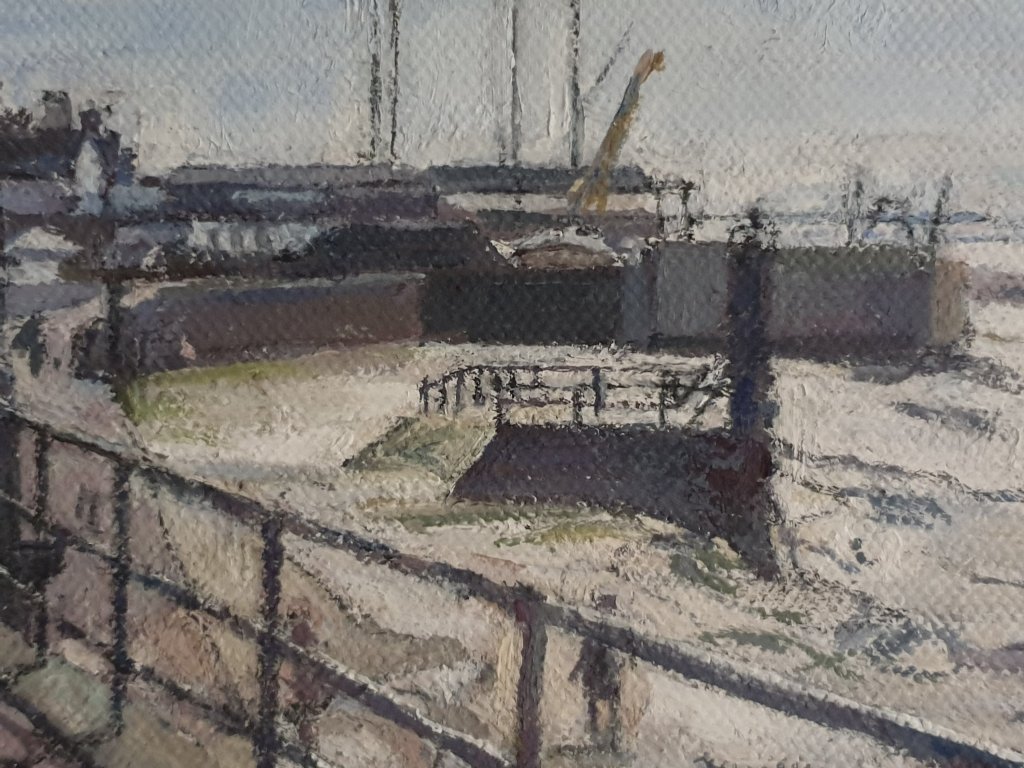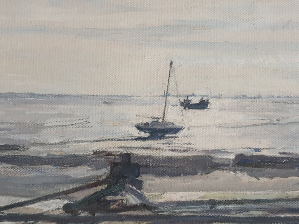 Because the light is good this morning, John’s seascapes look good – scenes of the harbour-side at Leigh-on-Sea where he has been painting for sixty five years, so knows it all intimately.
