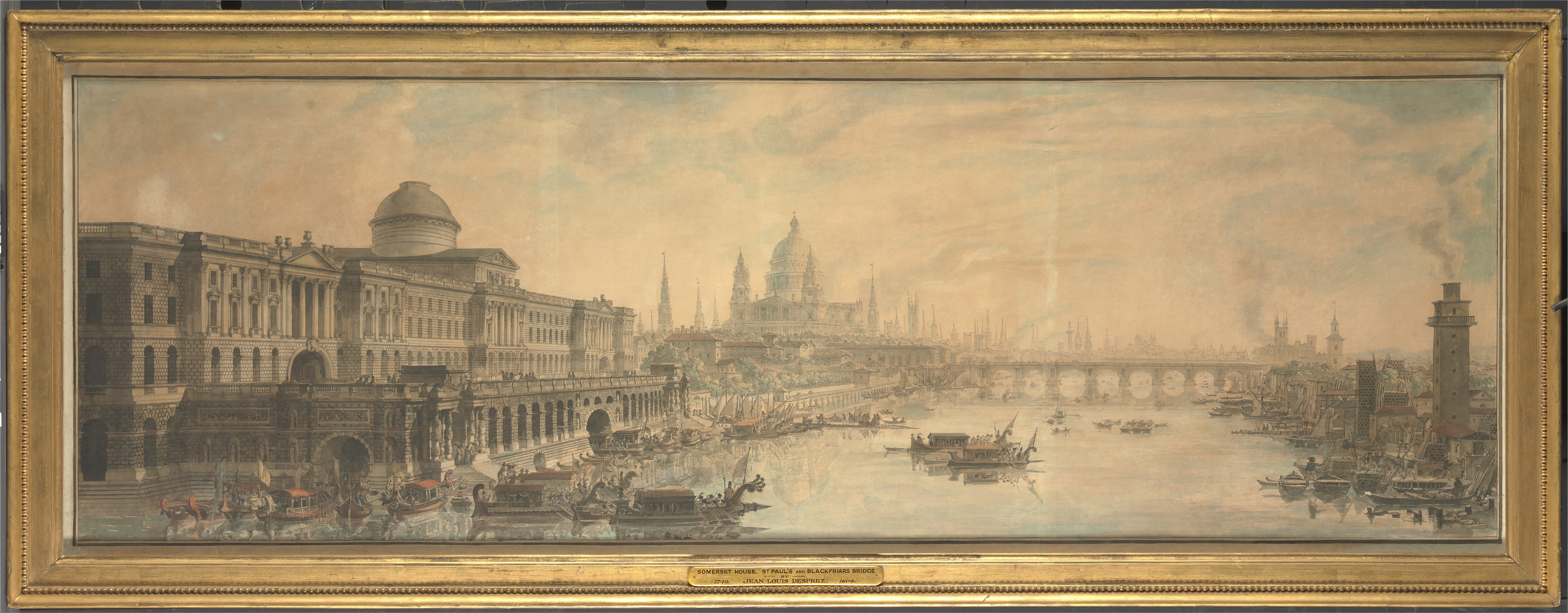 Desprez was a French neoclassical architect who was employed by Gustav III as a scene painter for the newly established Stockholm opera house. It shows so clearly how Chambers envisaged Somerset House as having a monumental presence on the river, now hard to appreciate since the construction of the Embankment.