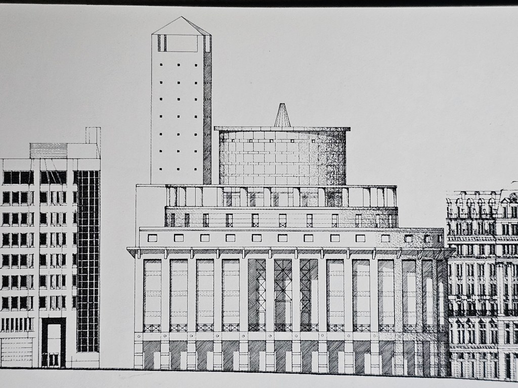 Post-1973, their paths diverged. There was not much work about, particularly the sort of public projects, including social public housing projects which had been available in the 1960s. Jeremy worked in partnership with his wife Fenella, initially on smaller-scale housing in west London and then after 1984 on the Royal Opera House after they had been invited by Bill Jack of BDP to enter the competition for the Royal Opera House and won it through a very complex, non-architectural process of competition. It was a project of large-scale and complex urban design, not helped by the well-mobilised opposition of the local community (the image which was submitted for planning approval is by Carl Laubin):-