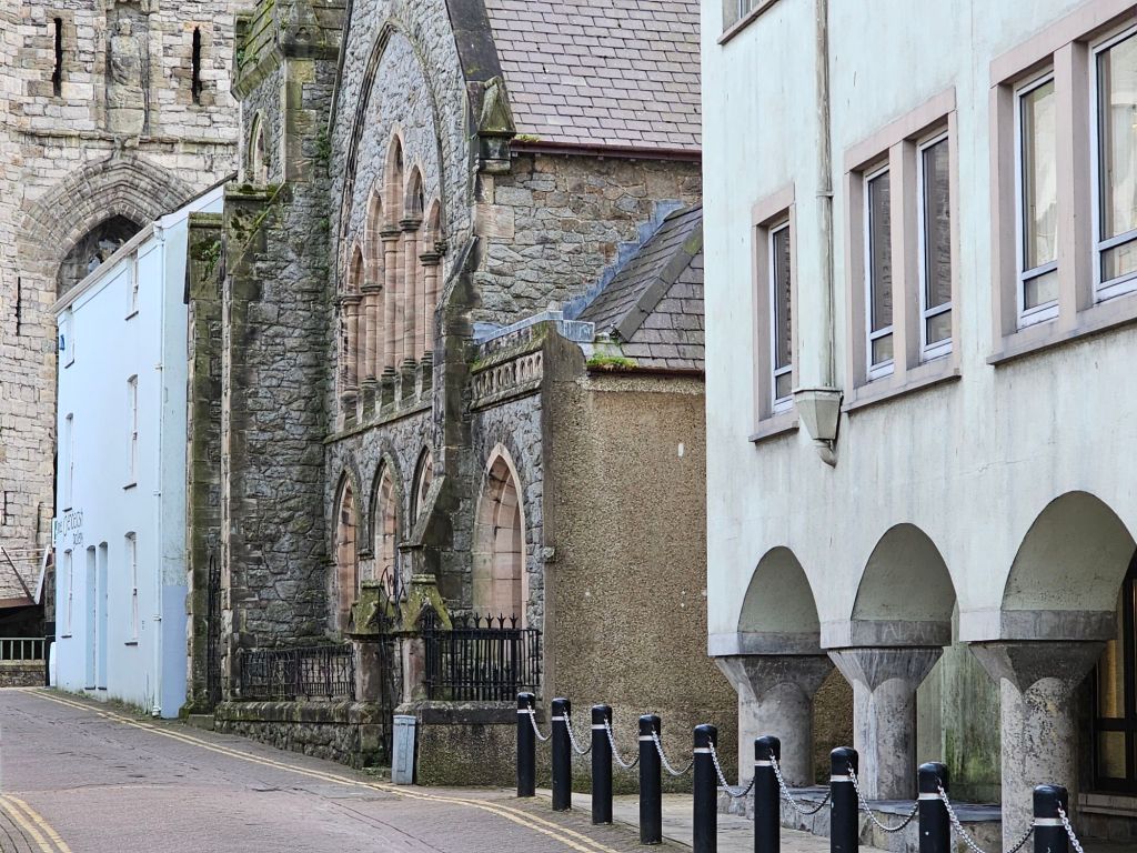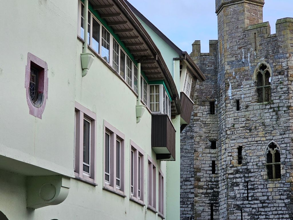 Following the recent Grade II listing of the headquarters of Gwynedd County Council (see below), I went to have a close look at them. It is scarcely believable that they were designed and built between 1982 and 1984. Pevsner in 2009 was pretty dismissive, describing them as relying ‘on pastiche instead of eloquent restraint’. This feels unfair. Given the extreme sensitivity of the site, in a street right next door to one of the greatest of Edward I’s castles, it looks to me to be an intelligent and thoughtful way of inserting large modern office buildings into a complex grid of essentially medieval streets. It was done by the county architects, but under the aegis and in conjunction with Professor Dewi-Prys Thomas, who ran the Welsh School of Architecture and was deeply interested in traditional Welsh architecture:-