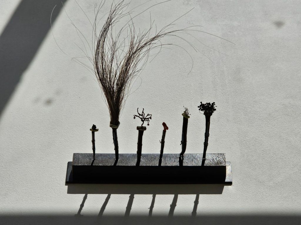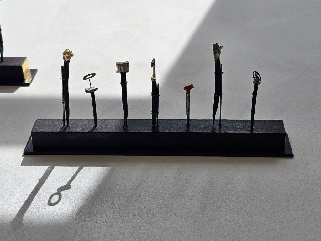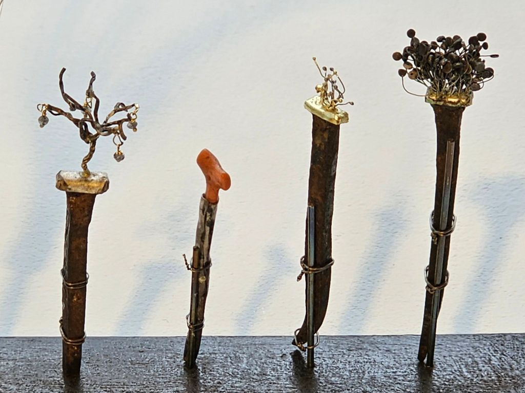 Romilly’s work is in the shop window of Make Hauser and Wirth in Bruton, based on nails from Old Master paintings:-