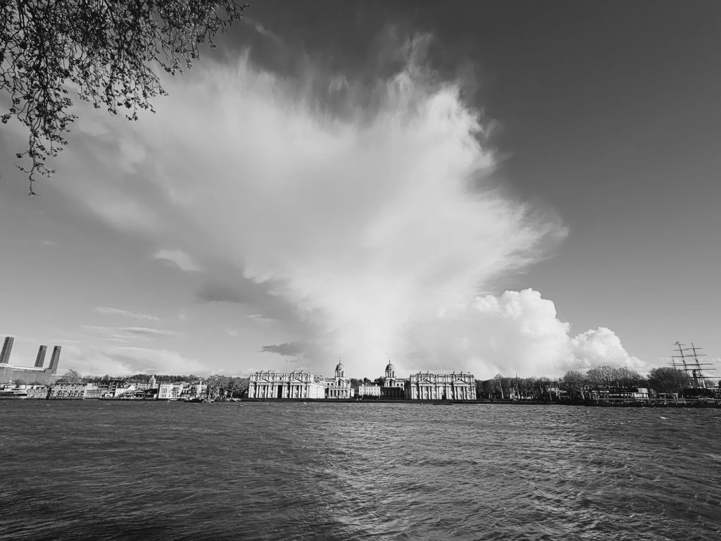 It was such a strange, stormy day, one minute hail, then fierce light, that I thought I would bicycle down to see Greenwich Hospital from across the river, one of the great views in London:-