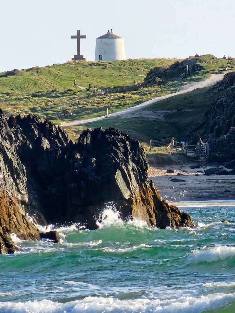 St. Mechell is a saint I have never heard of before: a miracle worker of the sixth century who turned thieves to stone and founded a clas, a type of small monastery, in Llanfechell in the north part of Anglesey. The church is long and narrow with an unusual and distinctive pepper pot spire which was apparently added in the eighteenth century:-