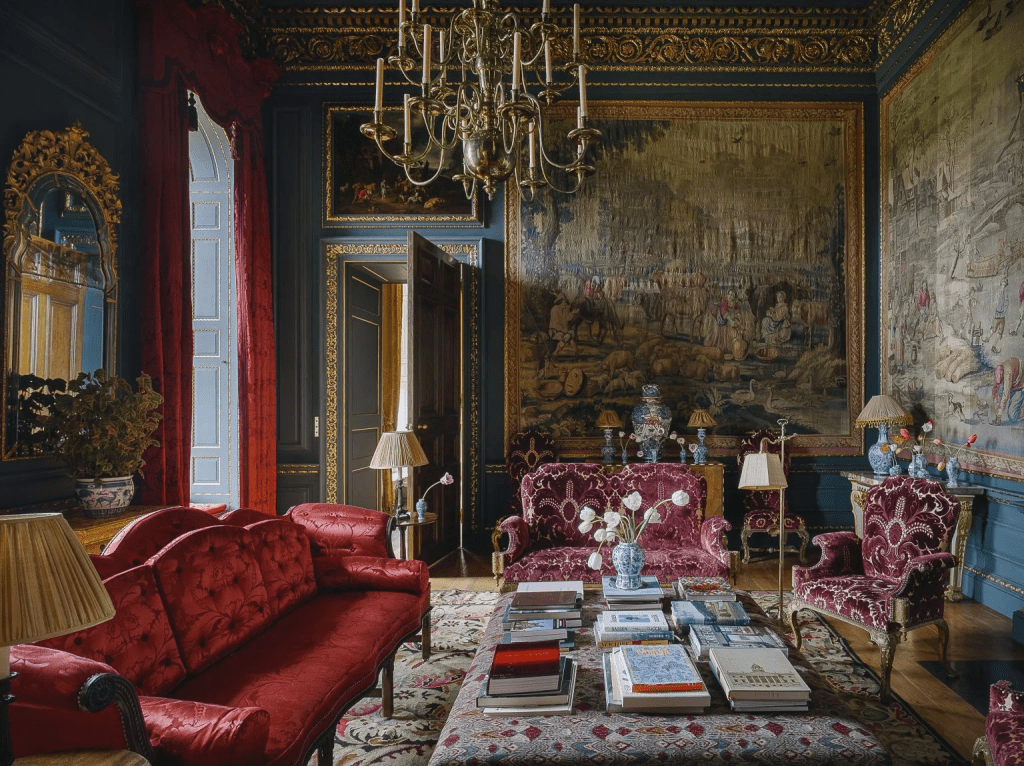 The most interesting change is the reconstruction of the Tapestry Drawing Room on the south front, one of the rooms which was completely burnt out in the disastrous fire in the early hours of the morning of 9 November 1940 when the house was occupied by a girl’s boarding school. The tapestries which had hung there were rescued, but the room itself remained a burn-out shell. So, the question was whether or not it should be restored as an exact replica of the room as it was immediately before the war, following the evidence of the photographs taken by Country Life. A decision was taken to recreate the room as it might originally have been, as designed by Vanbrugh, helped by the survival of the tapestries. This is what Francis Terry has done so remarkably successfully:-