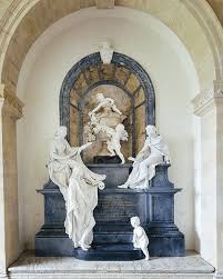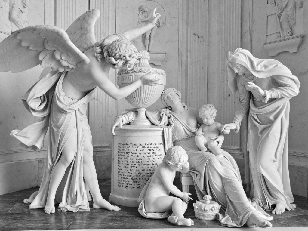 The Duchess died two years later in 1751. Her daughter, Mary, then commissioned Roubiliac to design a companion monument, equally fine, with the three fates, Clotho, Atropos and Lachesis, mourning her loss:-