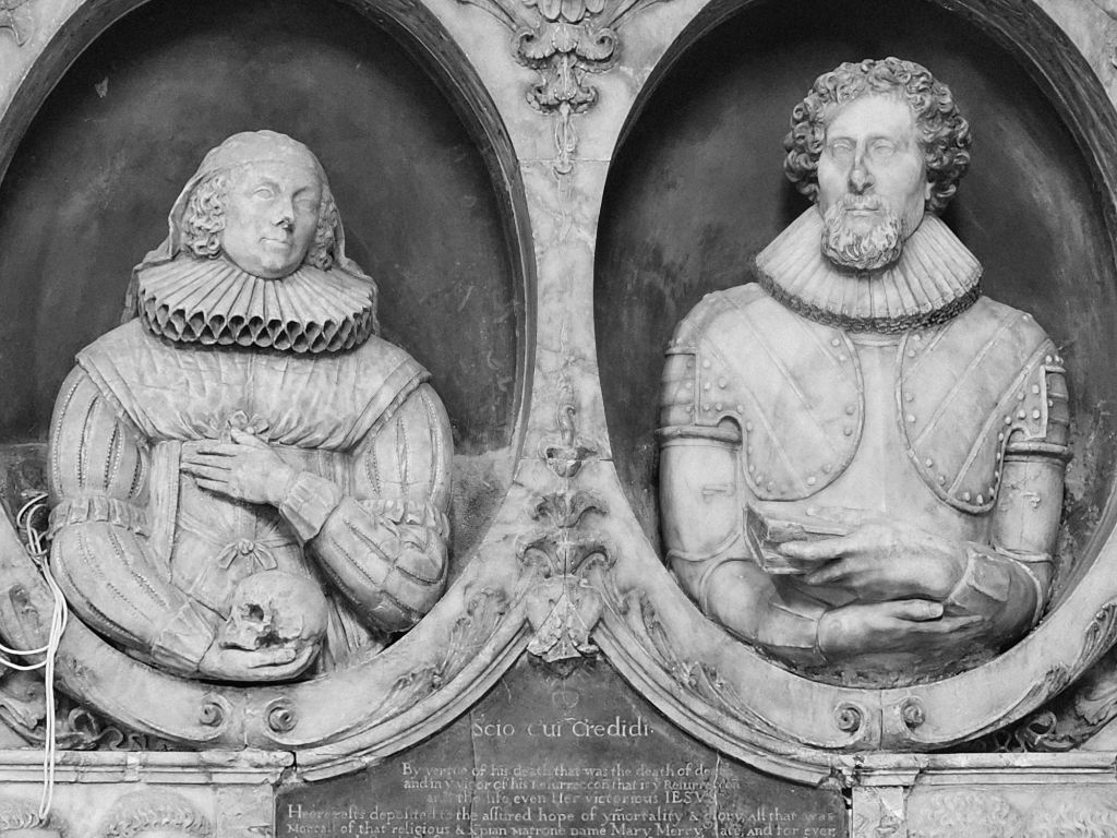In the chancel is a very good monument to Sir Thomas and Dame Mary Merry, commissioned by Thomas from Nicholas Stone the Elder in 1634, with excellent relief portraits of them both below:-
